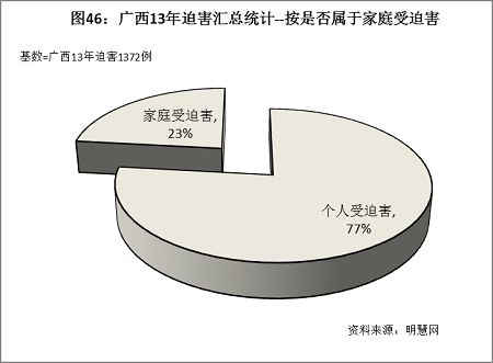 图46统计结果显示,在明慧网录得的这些迫害案例中,23%属于“家庭受迫害”,具体请参见我们从明慧网汇总到的70户广西地区属于“家庭受迫害”法轮功学员情况表(附录4:广西13年家庭受迫害案例汇总)。