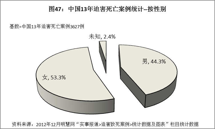 该汇总数据结果显示(图47),明慧网记录到的这3627例被中共迫害致死的法轮功学员中,女性占53.3%,男性占44.3%,另外有2.4%性别不详。