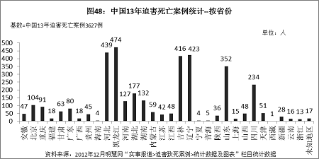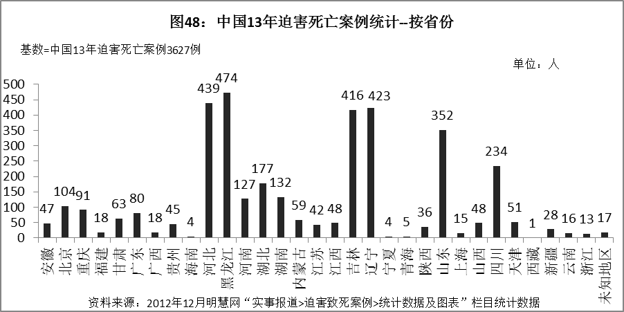 图48结果显示,3627例法轮功学员被迫害致死案例中,黑龙江死亡案例最多,有474例,其次河北439例、辽宁423例、吉林416例、山东352例、四川234例,广西18例。