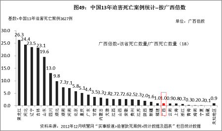 明慧网“实事报道>迫害致死案例>统计数据及图表”栏目整理出的3627例案例只是13年来在中国发生的法轮功学员被迫害致死案例的一小部分。我们仅以这个迫害致死案例数据作为基础,看看各地迫害严重程度,得到以下广西倍数阵列图。