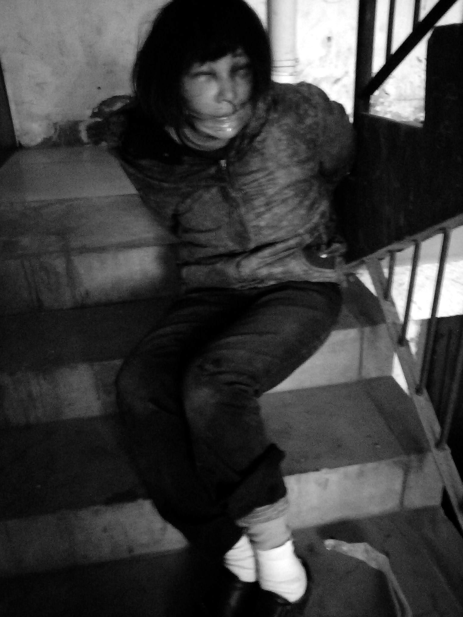 9:30左右,来了几个巡防队的人。有警察当时就说了一些指责的话,还有拿手机对我拍了照。有警察找来剪刀将我绑在楼梯上的胶带剪开。我下楼梯来到通道上,靠墙坐在地上。