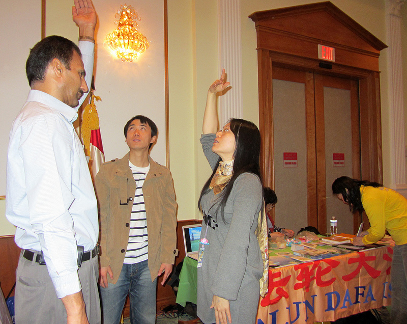 ![]() 有的民众当场学习法轮功的功法。 |