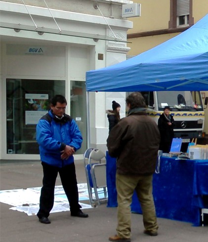 一位德国老人在展位前停住脚步,看学员的炼功动作。他说自己练过气功,以前奥芬堡这里发生过的“气功热”,那时多种气功流行,有来自越南的、泰国的、印度的、中国的等等,但是没过多久气功热就在当地就消退了。他认为降温的主要原因,是那些气功所强调的精神部份有问题,一些学练的人精神上出现了偏差。祛病效果也不好,之前练功练好的,不久病又返上来了,很多人最终害怕起气功来了。要说当初全德国的民众都很接纳气功的,而现在他们却顾虑重重。