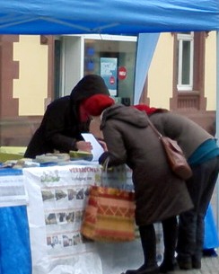 真相展台设在购物中心大门前,旁边是周末集市。天气虽然寒冷,但也不乏出来购物的市民。路过展台的人都接了学员派发的揭露中共活摘法轮功学员器官的真相资料,不少人主动签名支持法轮功反迫害,而且有好几位表示要学法轮功功法。