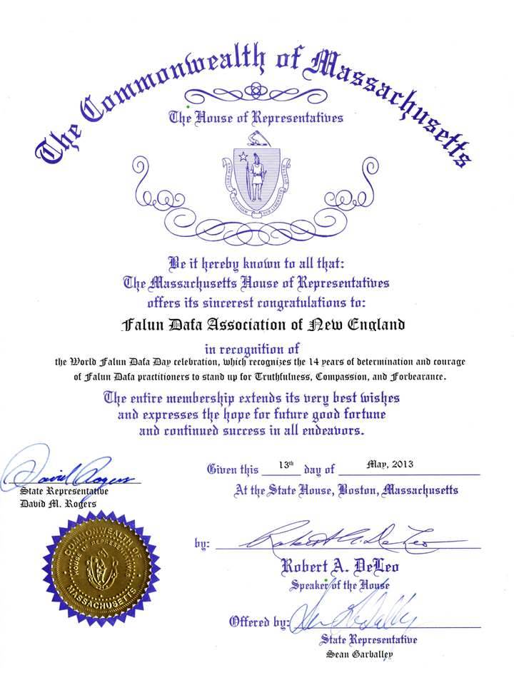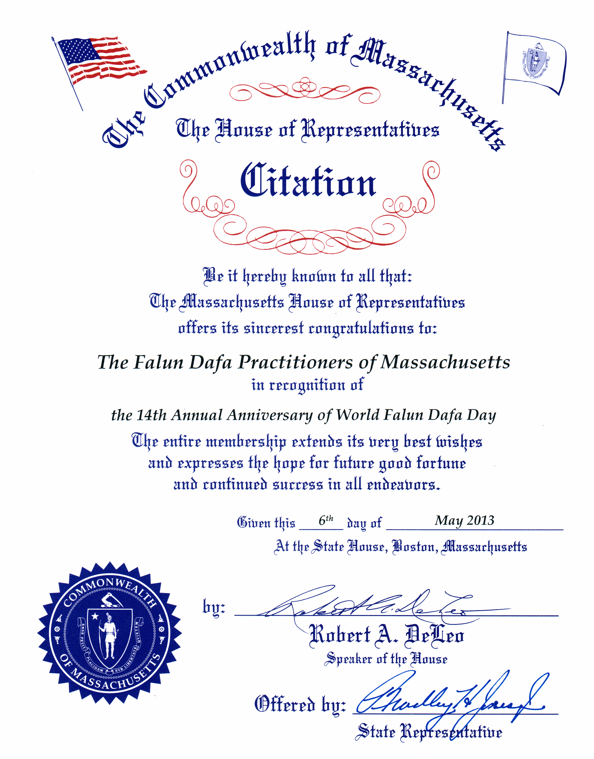 麻萨诸塞州众议院向麻萨诸塞州法轮大法学员祝贺第十四届世界法轮大法日,并致以最美好的祝愿,祝你们不断成功。