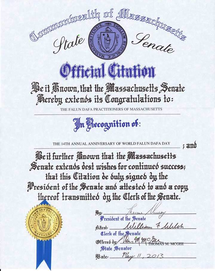 麻萨诸塞州参议院向麻萨诸塞州法轮大法学员祝贺第十四届世界法轮大法日,并致以最美好的祝愿,祝你们不断成功。