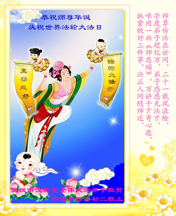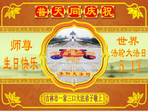 从学生时代就开始修炼法轮功的年轻夫妇,明正国中任教的方俪芬,先生是工程师吴伯轩,带着三位年幼的小娃儿,分别是两岁、一岁,吴伯轩还背着一个刚出生几个月的娃儿,一家五人很开心一起参加庆祝游行活动,这三个孩子还很特别取名为“宇真、宇善、宇忍”,俪芬说:“因为希望孩子以后能具备‘真、善、忍’的人格特质,能时时记得自己的名字,以‘真、善、忍’的标准要求自己,向同学介绍自己的名字时,也能借此将大法介绍给同学认识。”
