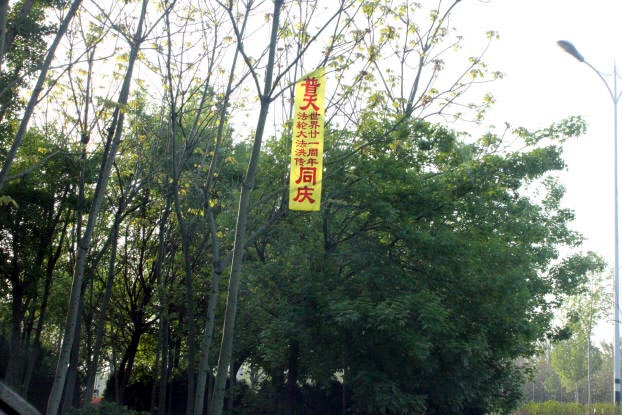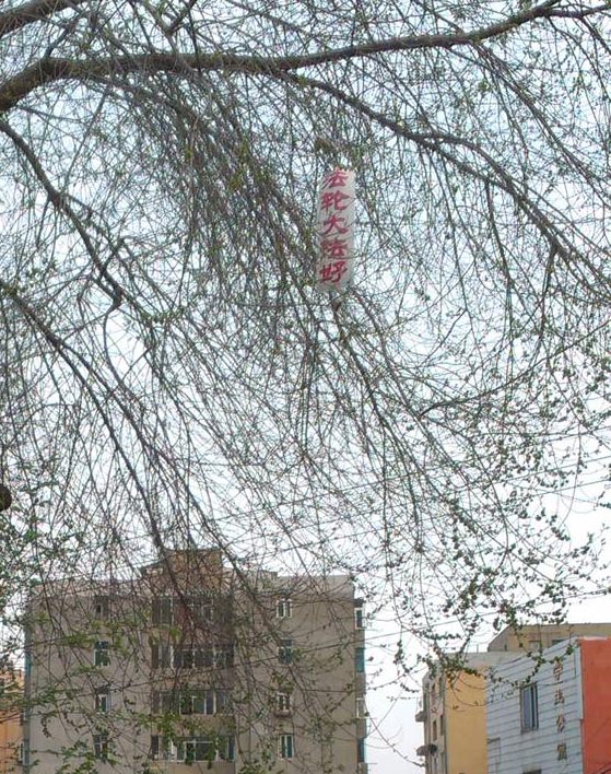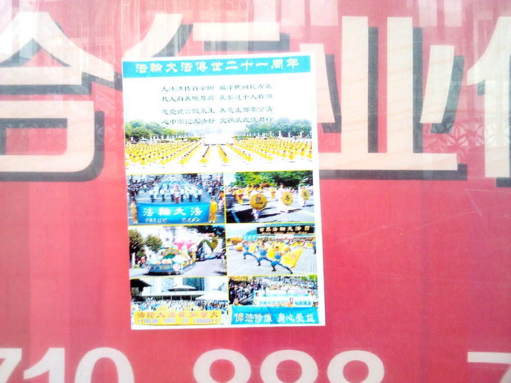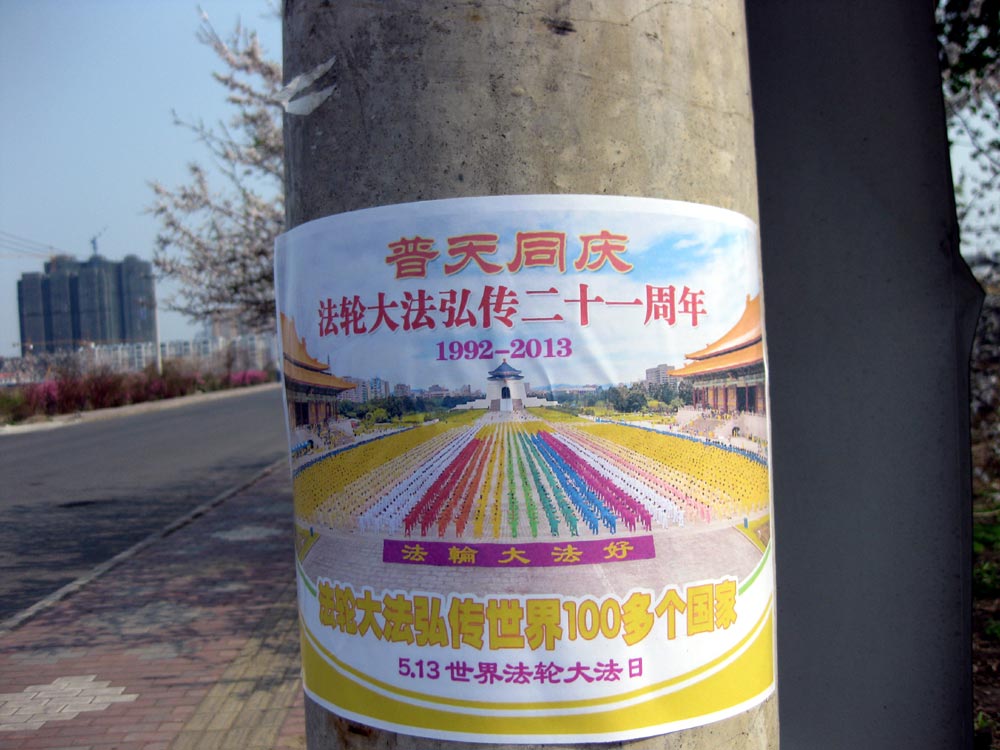 2013年5月11日,潍坊多处出现“普天同庆法轮大法洪传世界二十一周”年的横幅。