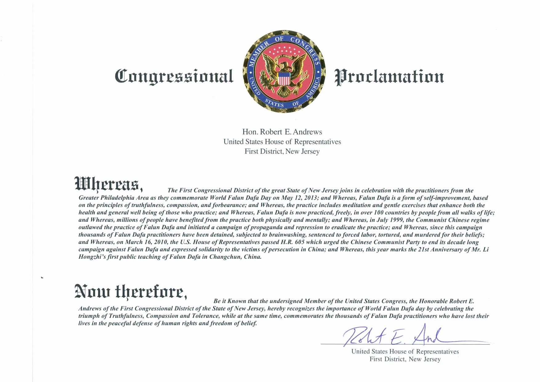 因此,我,罗伯特·安德鲁斯(Robert E. Andrews),美国国会议员,在此认同“世界法轮大法日”的重要性,并庆祝真、善、忍原则的成功推广;同时,也让我们铭记成千上万因为和平维护人权与信仰自由而失去生命的法轮大法学员。