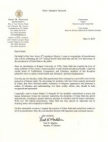 我代表新泽西州第四选区祝贺所有(法轮功)修炼者,共同庆祝第十四届世界法轮大法日和法轮大法洪传二十一周年。