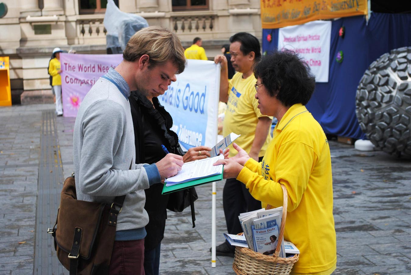 许多澳洲民众也很关注法轮功学员在中国遭受的残酷迫害,他们义不容辞的在请愿书上签名反迫害。弗格森说:“我最近才得知中国正发生着这样惊人可怕的迫害,我实在无法相信,我原本一点都不知道,现在我要为受迫害者挺身而出,尽我所能的去帮助,并且让更多人知道迫害的情况。”