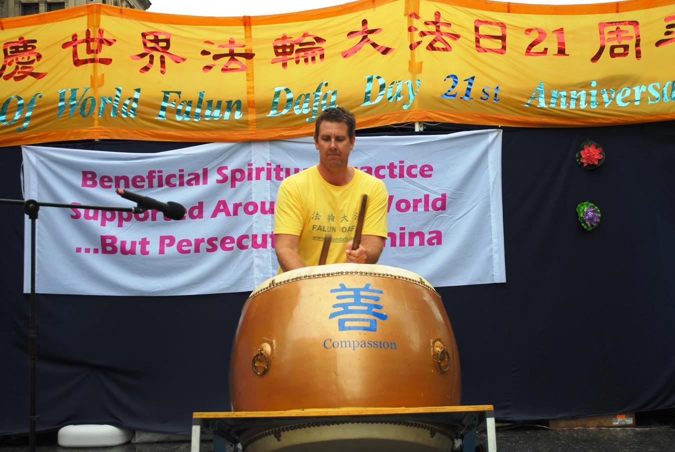 活动中,学员除了介绍和展示法轮功的五套功法外,也以腰鼓、歌唱、舞龙舞狮等表演庆祝世界法轮大法日和法轮功创始人李洪志先生的六十二华诞。