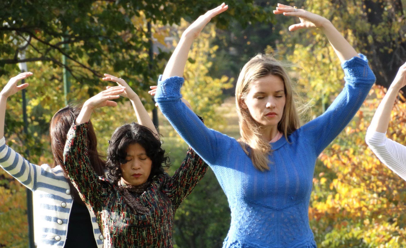 在集会现场,法轮功学员特别向市民展示了法轮功五套功法,纯净的心态、祥和的音乐、舒展的动作,吸引了不少路人随着学炼。