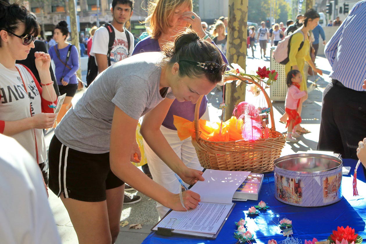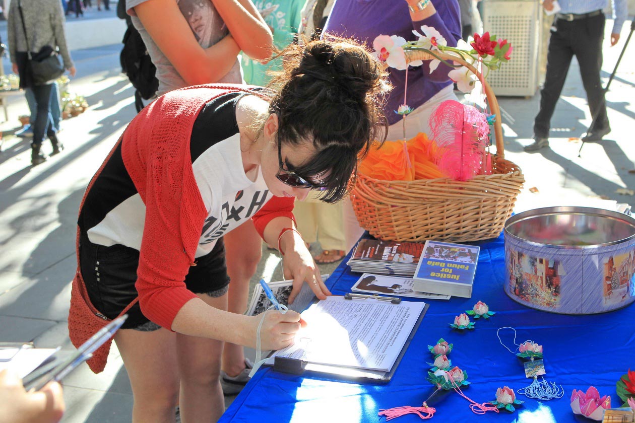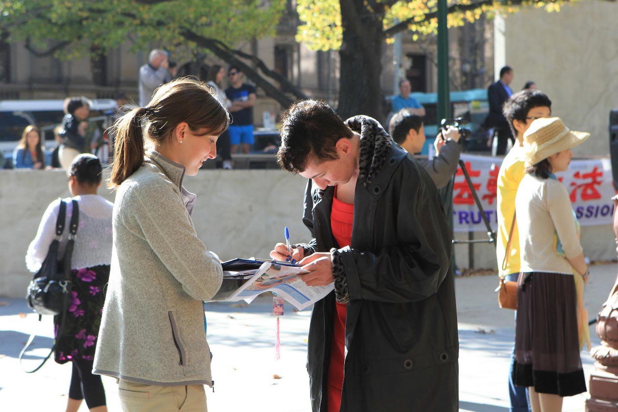 中共十几年对法轮功学员骇人听闻的迫害令在场观众触景生情,无不为之动容,不少人更是掩面哭泣。精彩的街头音乐剧吸引并震惊了大量过往行人,人们纷纷索要传单,在征签表上签字表示支持。