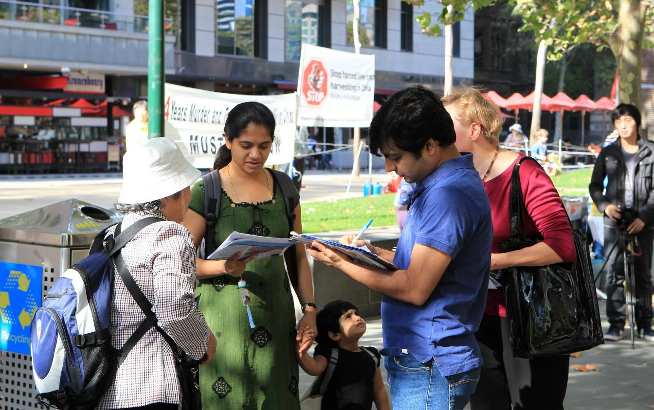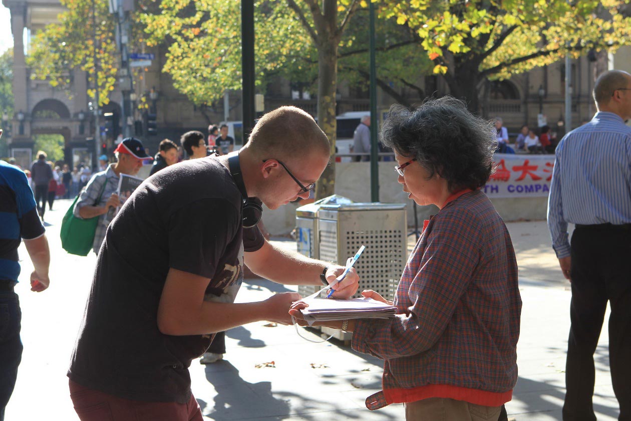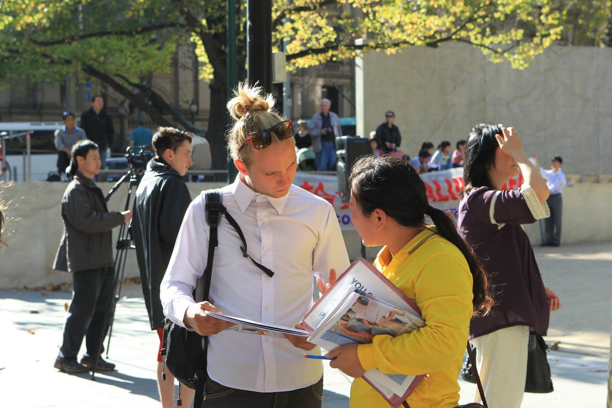 中共十几年对法轮功学员骇人听闻的迫害令在场观众触景生情,无不为之动容,不少人更是掩面哭泣。精彩的街头音乐剧吸引并震惊了大量过往行人,人们纷纷索要传单,在征签表上签字表示支持。