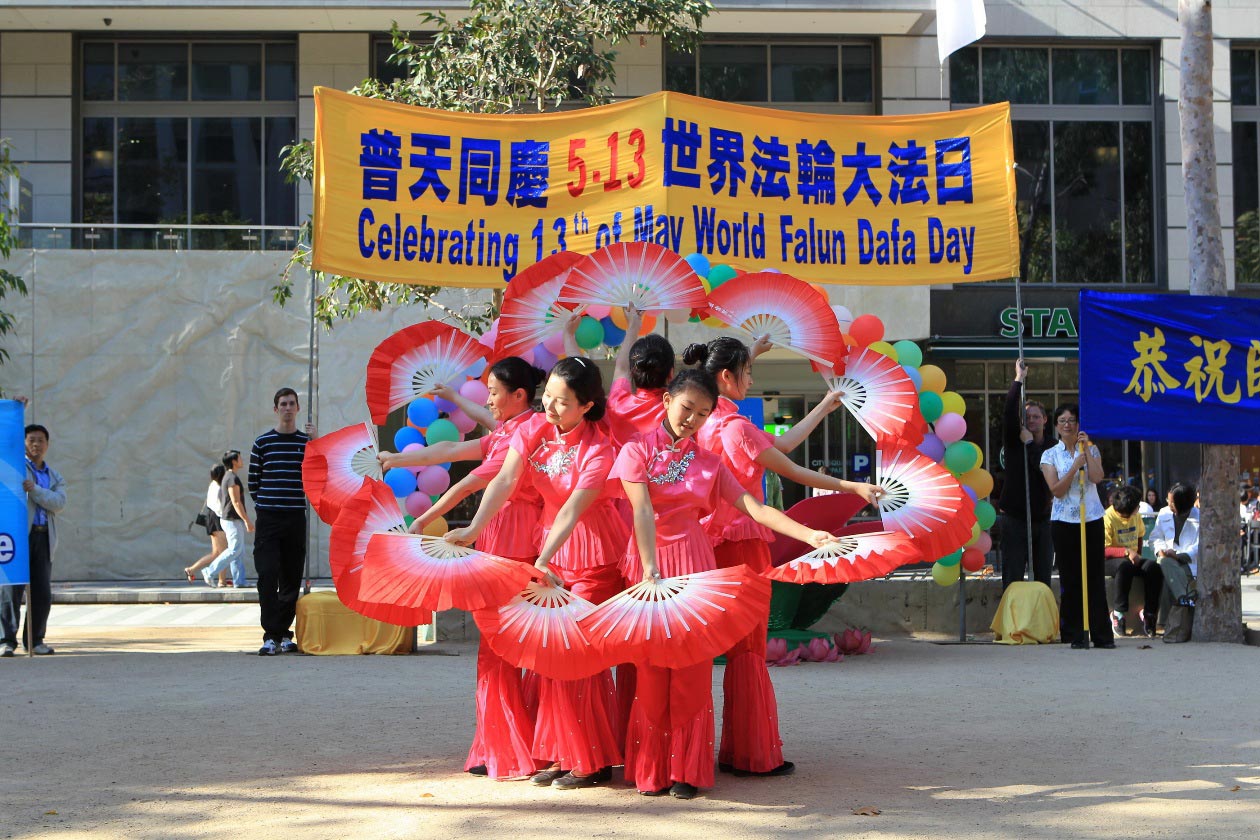 当天的庆祝活动长达四个多小时。天国乐团所演奏的《法轮大法好》、《法鼓法号震十方》、《法正乾坤》、《送宝》与《佛恩圣乐》等雄浑激昂的乐曲,法轮功学员还表演了优雅的扇子舞,丝带舞和喜气洋洋的腰鼓,赢得现场观众的掌声、喝彩声不断。