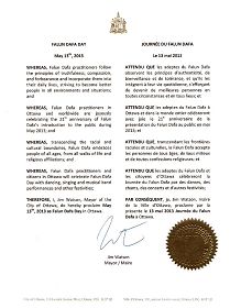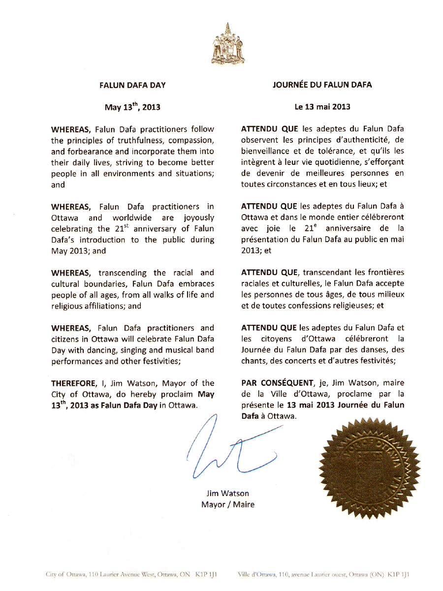 因此,我,吉姆•沃森,渥太华的市长,宣布二零一三年五月十三日为“渥太华法轮大法日”。
