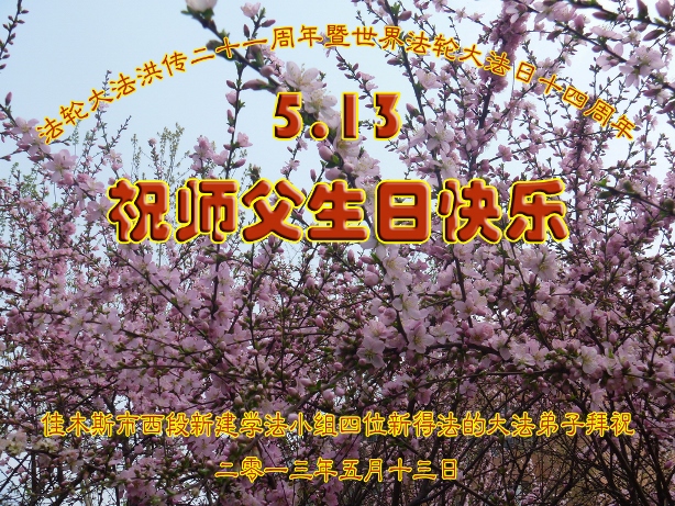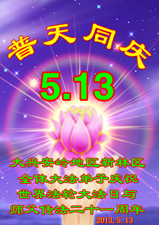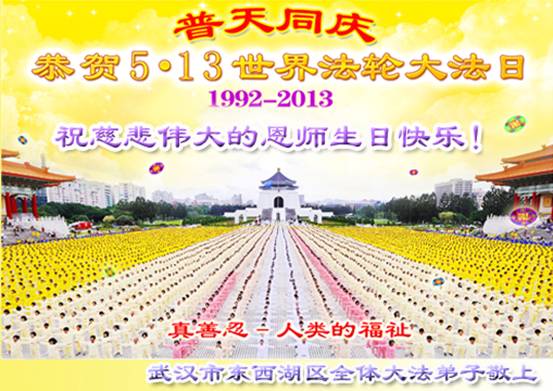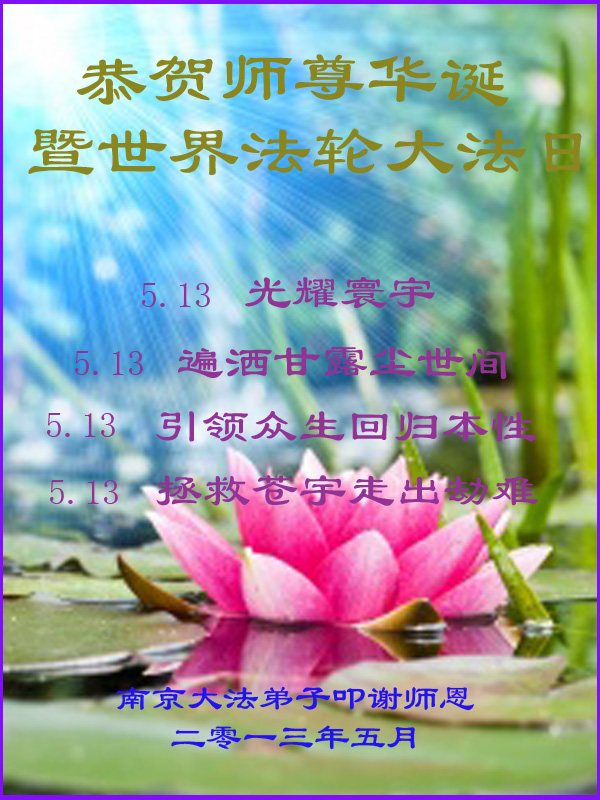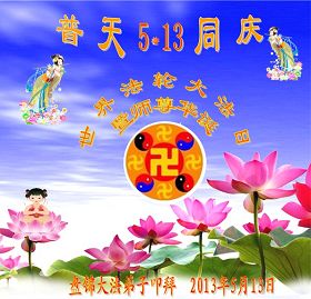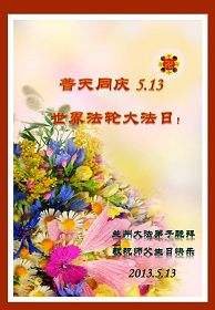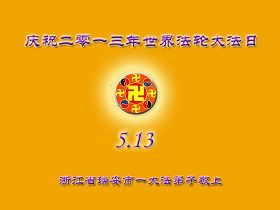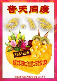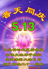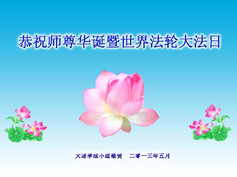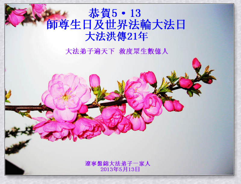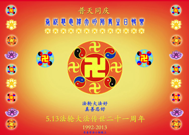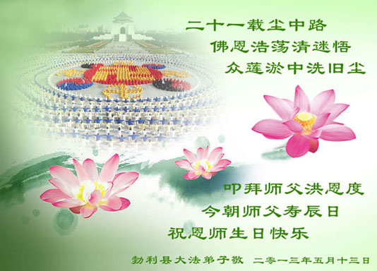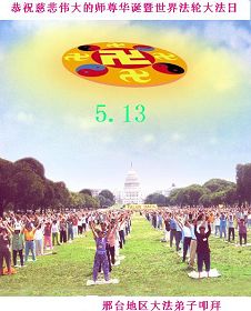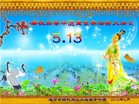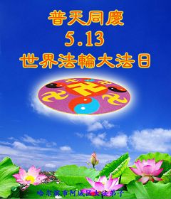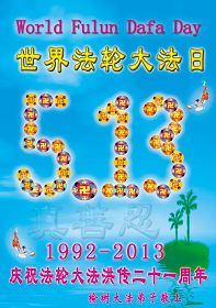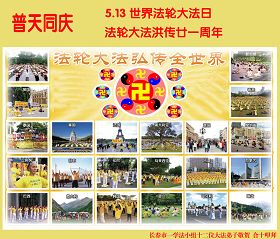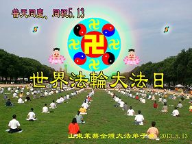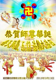 【明慧网二零一三年五月十三日】(明慧记者黄宇生台湾中坜采访报导)在世界各地的法轮功学员的心中,每年的五月十三日是值得感恩的日子,因为法轮功是一九九二年五月十三日在长春首次传出,而五月十三日亦是李洪志老师的生日。因此,二零零零年起,这一天被定为“世界法轮大法日”。每年的五月十三日,各地学员都会以不同的活动形式来表达他们内心对师父由衷的感恩,也借此向来往的人们传递大法的美好。