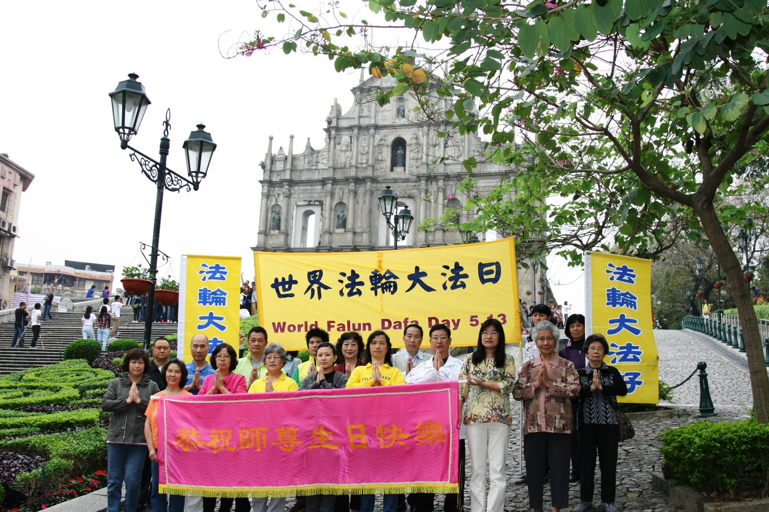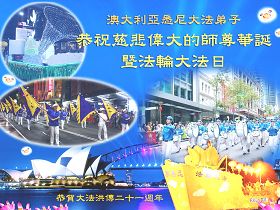 最后,庆祝大会在法轮功学员们齐声恭祝 师父生日快乐、合唱“法轮大法好”歌曲后,踩街队伍有天国乐团、仙女队、腰鼓队、功法表演、还有举着‘法轮大法好’、介绍法轮功的各式长型横幅的旗队,在警察协助指挥交通下绕行当地热闹的市街,四周的人行道旁还有法轮功学员演炼五套功法的功法长城,吸引民众围观,连路经的外国人也表示想习炼法轮功。