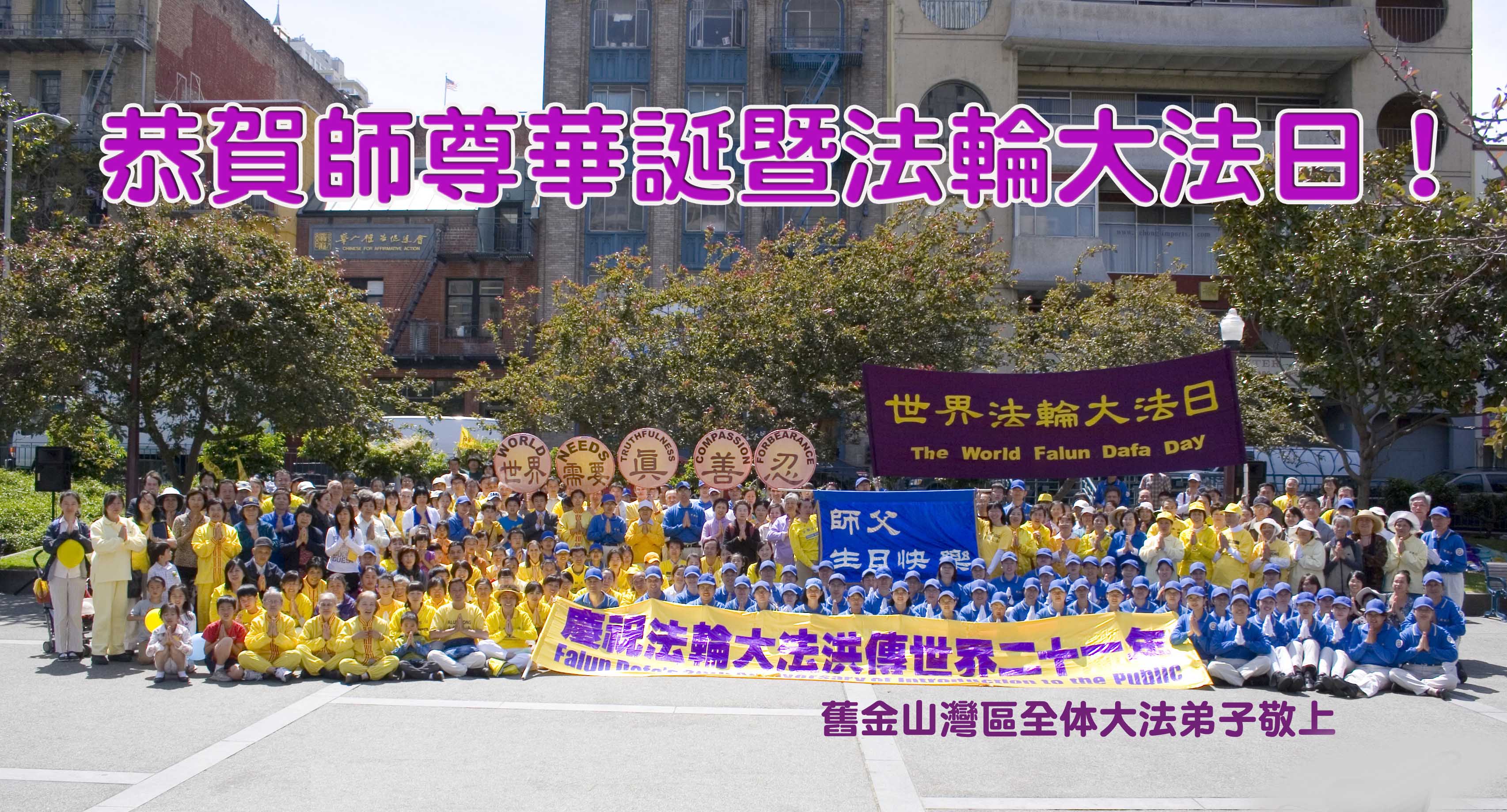 巨大的法轮功书籍的模型在阳光下格外醒目。由男女老少法轮功学员组成的炼功方阵,向人们演示着法轮功的功法,整齐祥和。游行队伍经过旧金山主要街道行进,然后在中国城绕行一周,最后抵达花园角广场。学员们以舞蹈、诗朗诵和修炼心得交流来庆祝法轮大法日。
