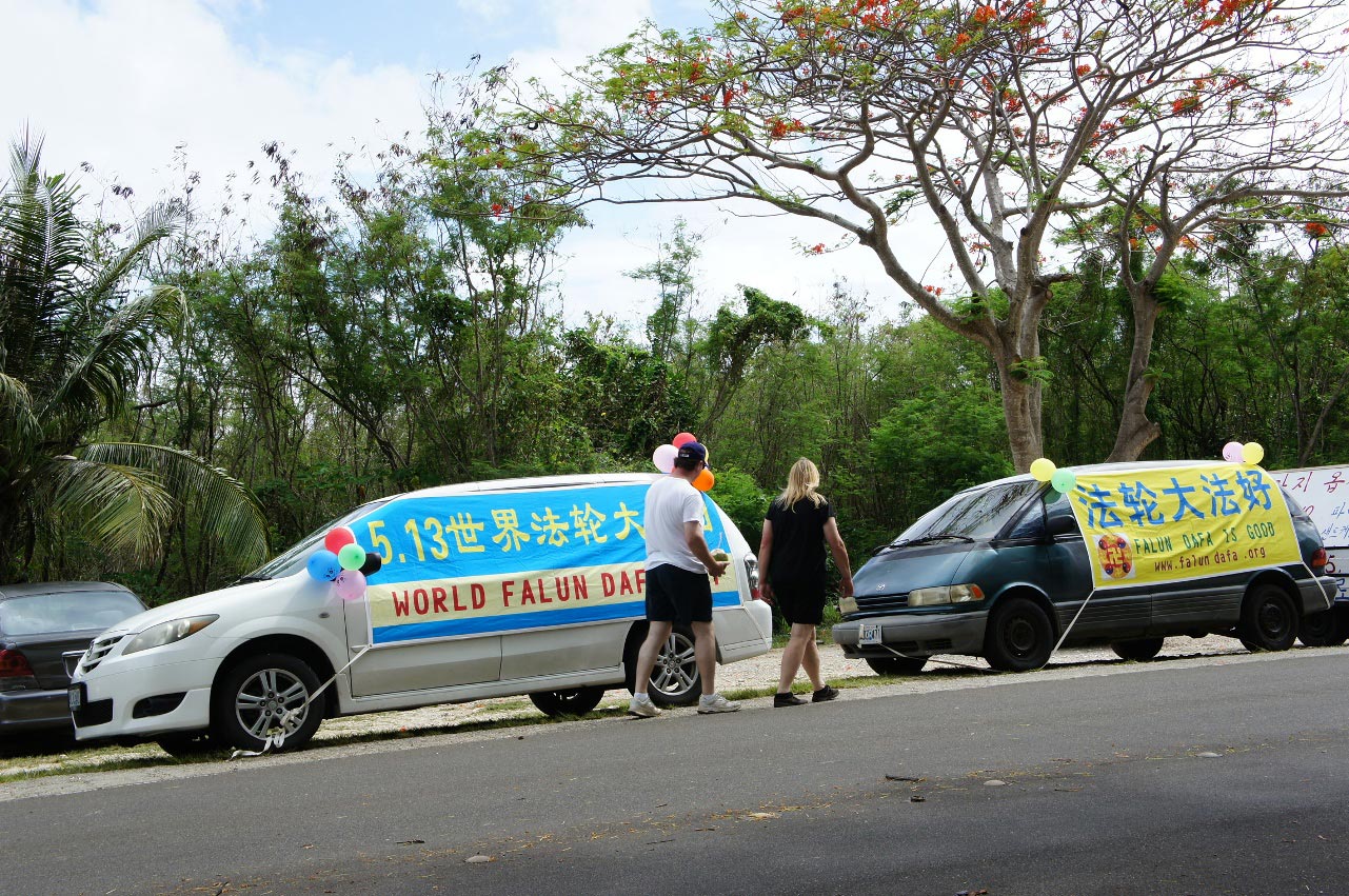 今天同往常一样每周日去景点讲真相。为了庆祝第十四届“世界法轮大法日”将气球、 “庆祝世界法轮大法日”、“五一三世界法轮大法日” 、“法轮大法好”,的横幅悬挂在车身或炼功的地方。横幅的内容展现了大法的美好,以及大法弟子对师尊慈悲苦度的感谢。
