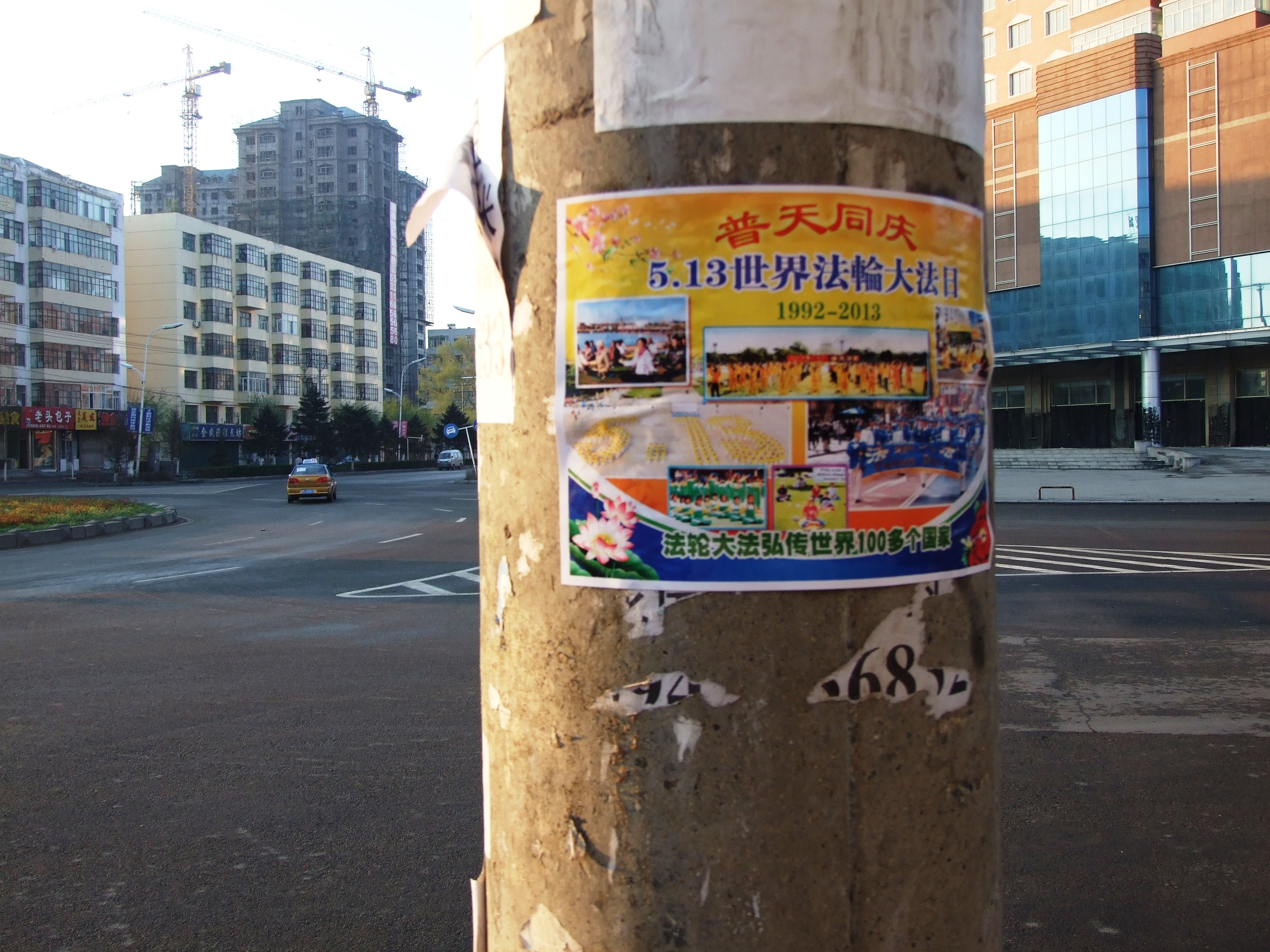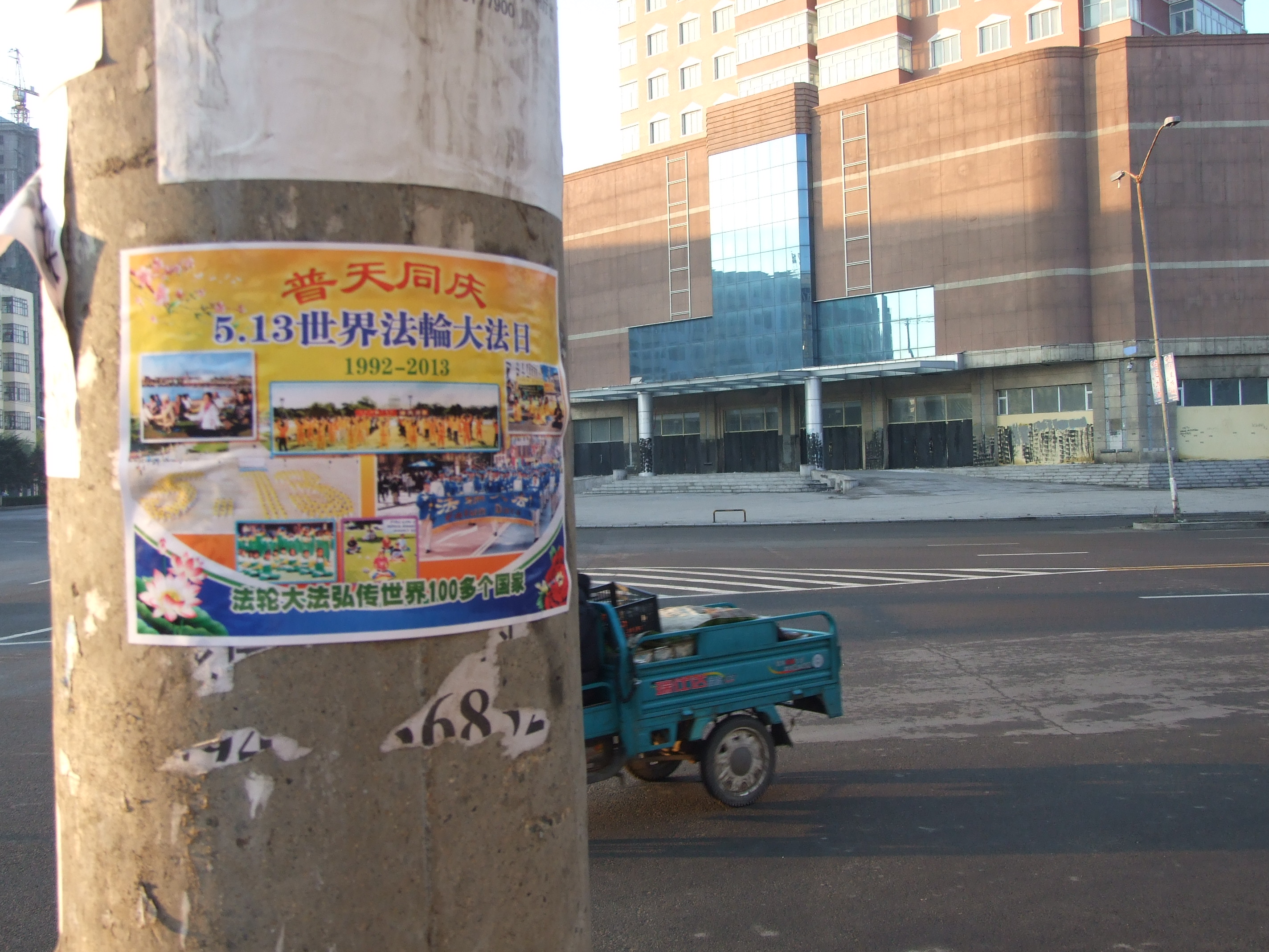 东北某乡镇5.13世界法轮大法日期间出现了恭祝法轮大法日等条幅,还有普天同庆法轮大法洪传世界二十一周年的粘贴。