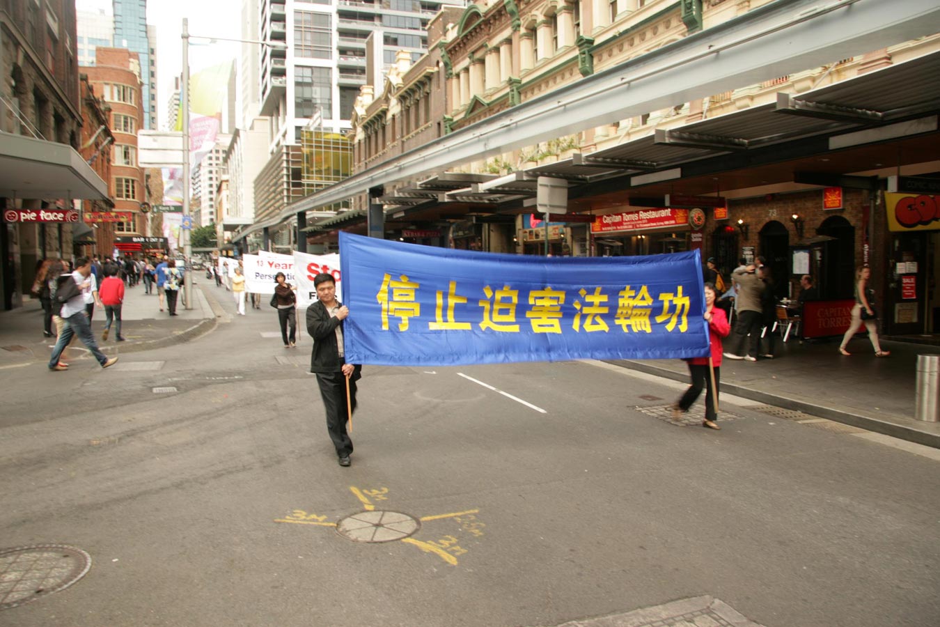 中午一点钟,庞大的游行队伍从悉尼市中心市政厅广场出发,沿乔治大街,抵达唐人街旁的娱乐中心广场,队伍中展示了《转法轮》巨型模型和多面大型横幅,横幅上写有醒目清新的大字:“世界需要真、善、忍”、“法轮大法好”、“真、善、忍”等,天国乐团队员身着蓝衣白裤,威武整齐地行进在队伍的前例,腰鼓队英姿飒爽,龙飞狮舞祝贺神功传世,典雅高贵的仙女轻纱曼舞,多才多艺的法轮功学员们纷纷拿出自己的专长,都希望能在这一珍贵的日子里献上一份心意,表达自己的无限感恩,那是生命走向新生,了解真理后的无限激动与喜悦。