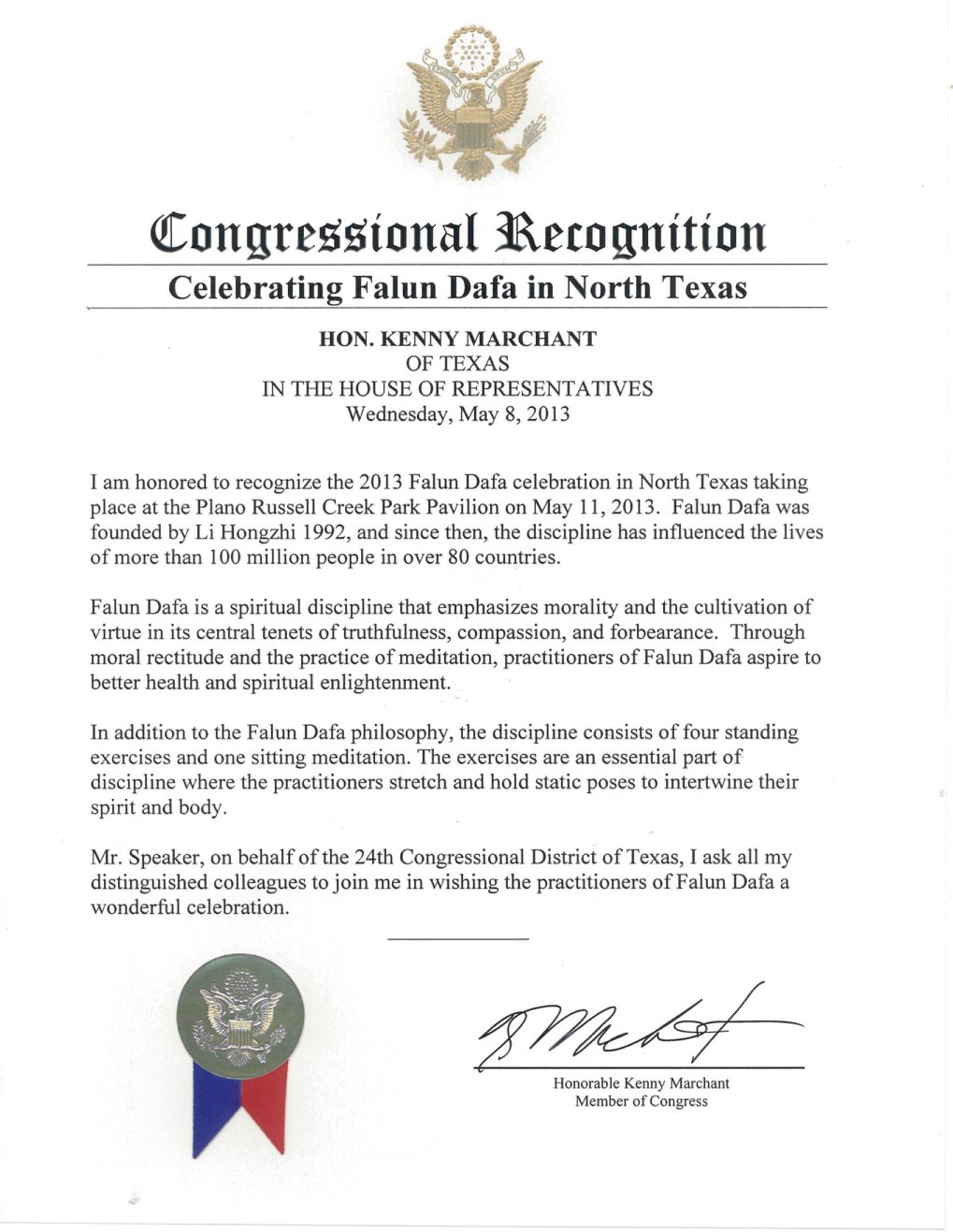 我荣幸地了解到法轮功学员于二零一三年五月十一日在布兰诺Russell Creek公园举行法轮大法庆祝活动。李洪志先生于一九九二年创立法轮大法。自那以来,法轮大法已经改变了八十多个国家上亿人的生活。