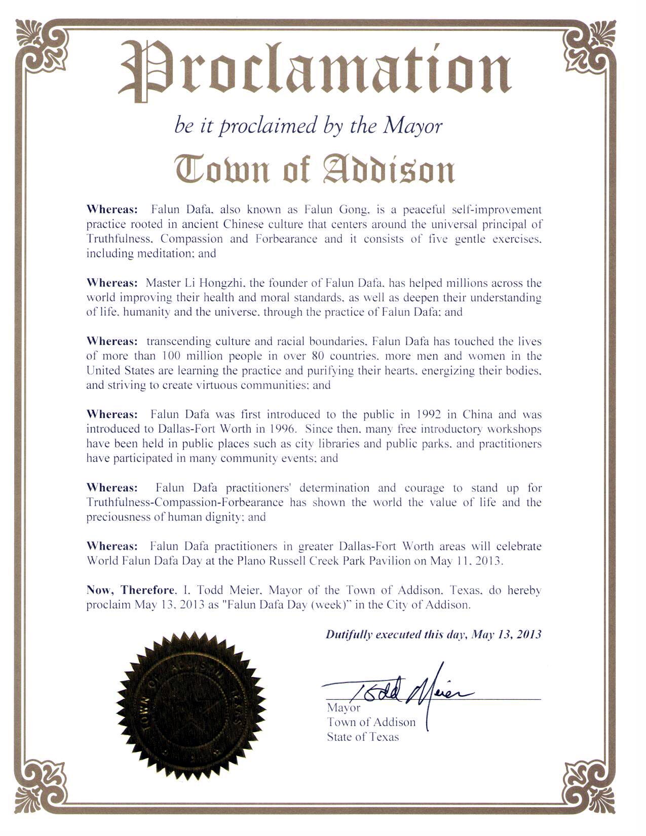 鉴于,达拉斯-福特沃斯地区法轮大法学员在五月十一日在布兰诺Russell Creek公园庆祝世界法轮大法日;