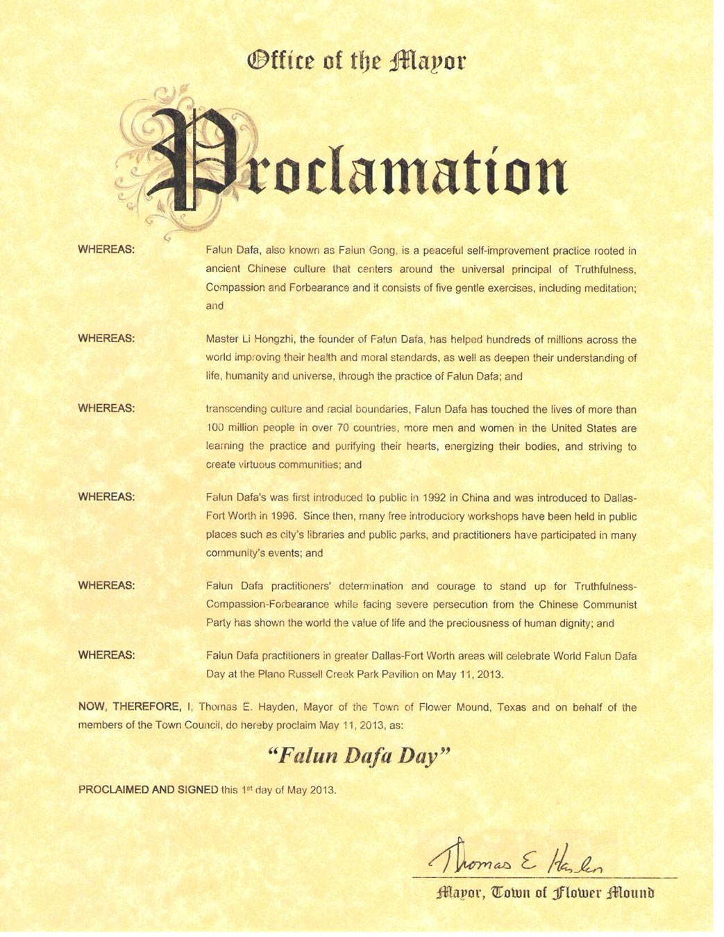 【明慧网二零一三年五月十四日】美国德克萨斯州花岗市(Flower Mound)市长托马斯·海顿(Thomas E. Hayden)宣布五月十一日为法轮大法日。