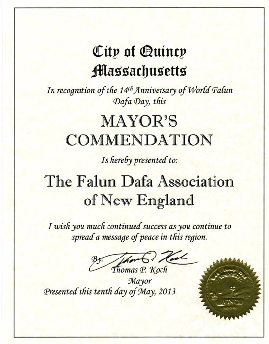 麻州昆西市褒奖第十四届世界法轮大法庆典日,市长特此嘉奖新英格兰法轮大法协会我祝愿你们继续在本地区传播和平信息而不断取得成功。