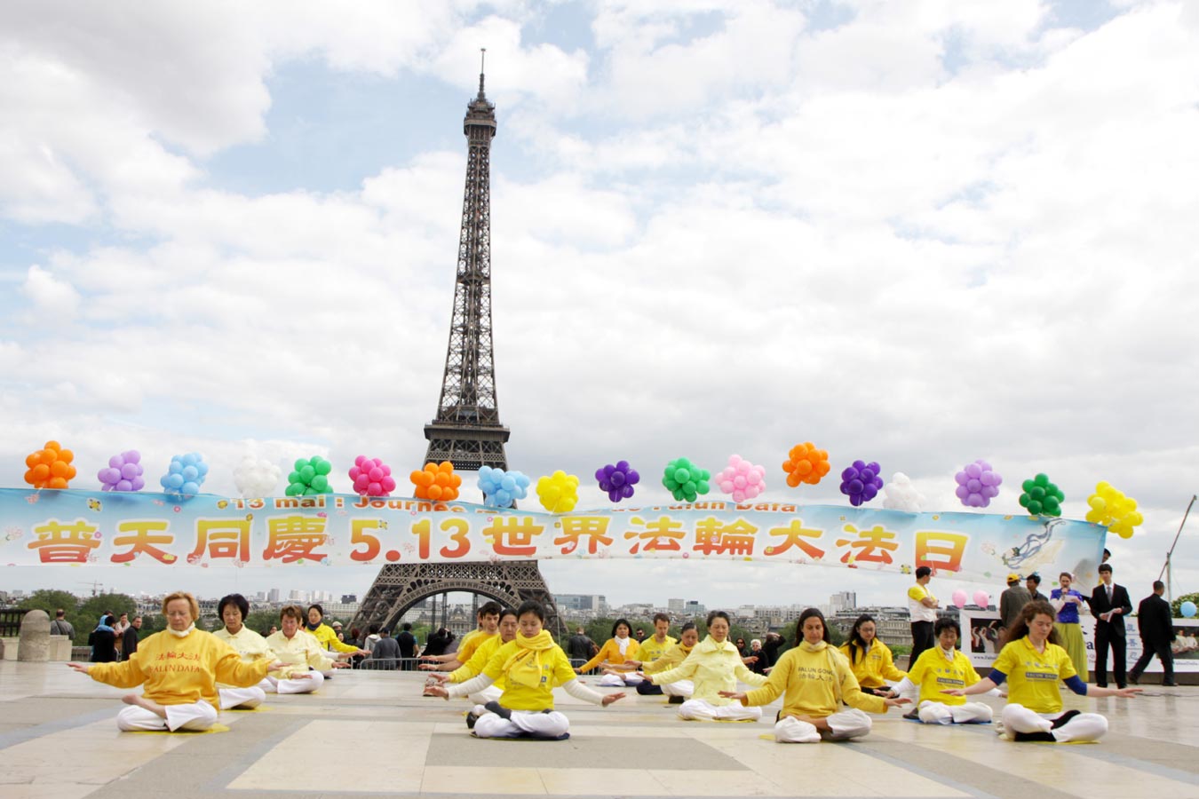 法国的法轮功学员从二零零零年五月十三日开始,每年都会在象征“人权、自由、平等”的巴黎人权广场庆祝法轮大法洪传世界和开展各种讲真相的活动,今年已经走入第十四个年头,数不清的中外游客因此了解了法轮功,支持法轮功学员和平、理性的反迫害,越来越多的中国游客开始走出中共制造的恐怖,在巴黎的人权广场了解到真相,也有不少人因此走入法轮大法的修炼行列中。