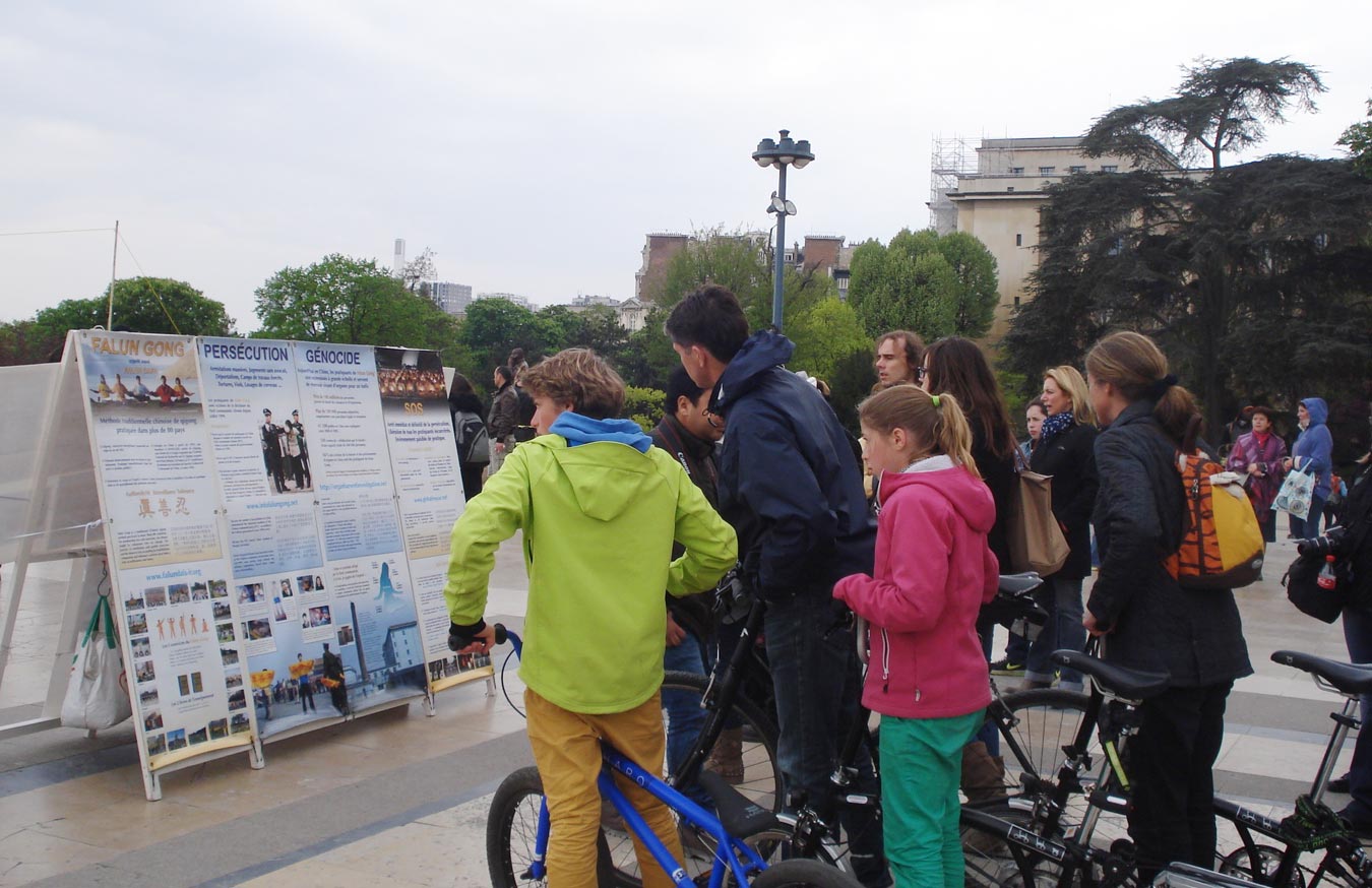 二十几位来自大陆的游客刚好来到广场准备拍照留念,却意外地看到了庆祝法轮大法日的活动,“普天同庆5.13世界法轮大法日”的条幅吸引他们靠近活动场所,观看舞蹈和功法演示。看到法轮功真相展板时,他们不禁靠近阅读,有的把展板上的信息逐字逐句完全读完,不少中国游客用相机和手机把看到在巴黎的法轮功学员庆祝世界法轮大法日的情况拍摄下来。