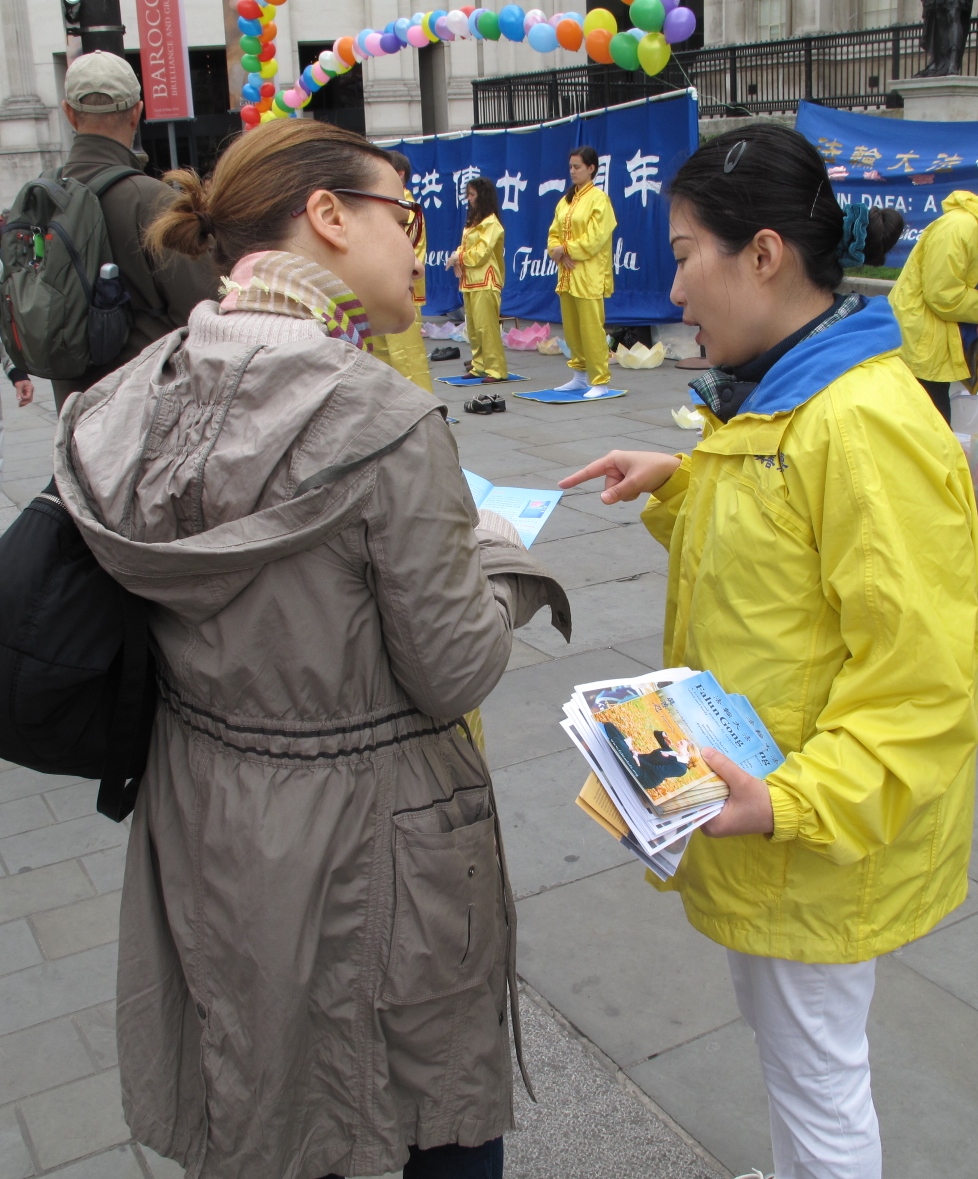 在一整天为时六个小时的庆祝活动中,有成百上千的人抓住机会走近法轮功,法轮功学员不断地向不同的行人重复着同样简单的信息:“法轮大法好”、“世界需要真善忍”。