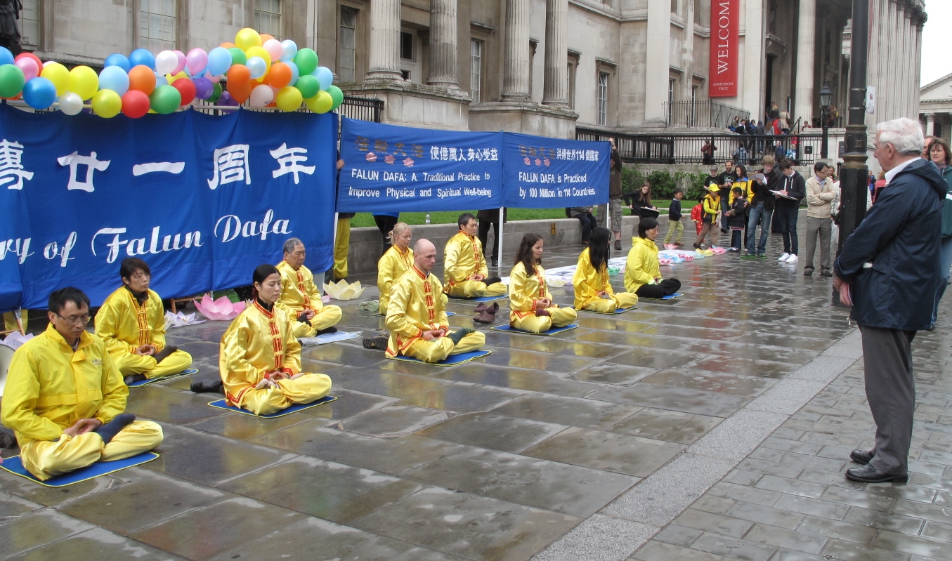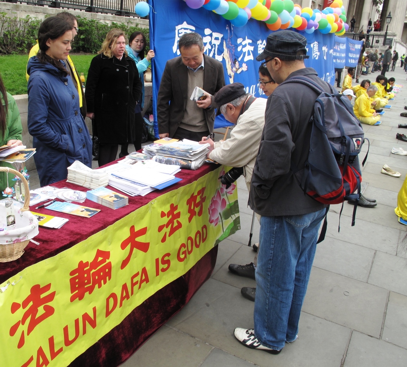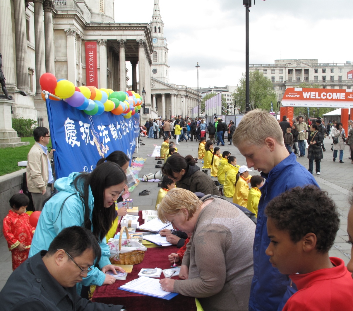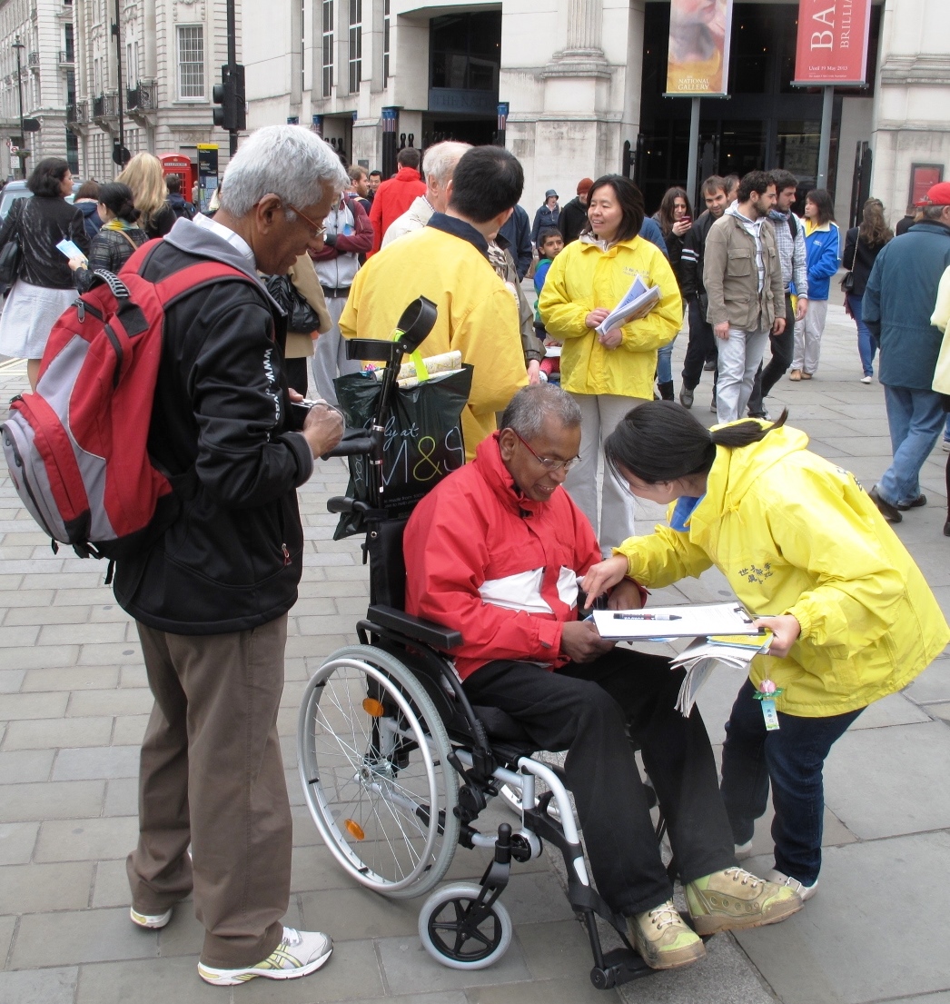 很多人在了解到中共对法轮功长达近十四年的迫害后,表示支持法轮功,踊跃地在反迫害征签表上签名。坐在轮椅上的印度裔荷兰人班瓦瑞先生(A. Banwarie)被哥哥推着来鸽子广场观光,他在听到法轮功被迫害的故事后主动要求签字反迫害。住在北伦敦的高中生阿历克斯第一次清楚看到法轮功被迫害事实,于是毫不犹豫地在征签表上签名,他说他这样做只是因为这样做是对的。他还表示他要去更多地了解法轮功,并计划去向周围的朋友谈及法轮功。