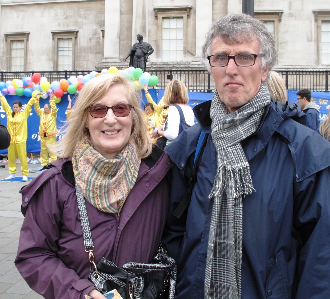 这次在伦敦再次与法轮功相遇,夫妇二人长时间驻足观看法轮功功法演示,被法轮功的祥和宁静的能量所打动,认为这样好的功法,这样对人的身体和精神都有帮助的功法对当今社会来说是希望,应该在英国社会去广泛推广。玛丽说:“当今的社会太物质化,我们生活在一个充斥暴力的社会,很遗憾法轮功没有在英国学校传授,如果那样就太好了。”