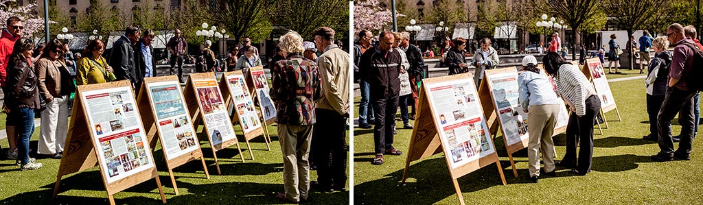 ![]() 民众观看真相展板了解法轮功真相 |