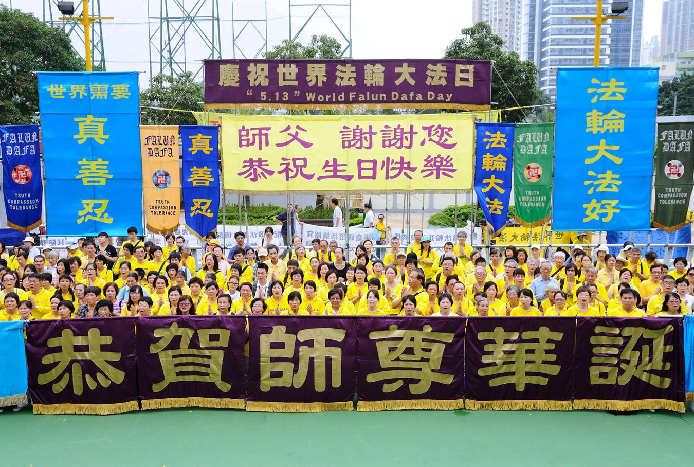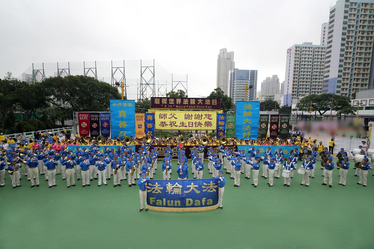 十二日上午,法轮功学员聚集九龙长沙湾游乐场炼功,揭开庆祝活动的序幕,天国乐团演奏“谢谢师父”、“法轮大法好”等乐曲,威震八方的旗鼓队以及喜气洋洋的腰鼓队表演,借此表达对师尊的无限尊敬与感恩,学员齐声“恭祝师尊生日快乐”的祝贺响彻云霄。