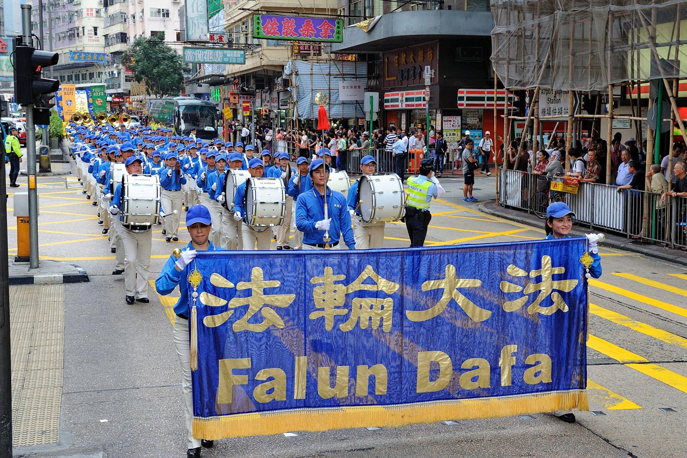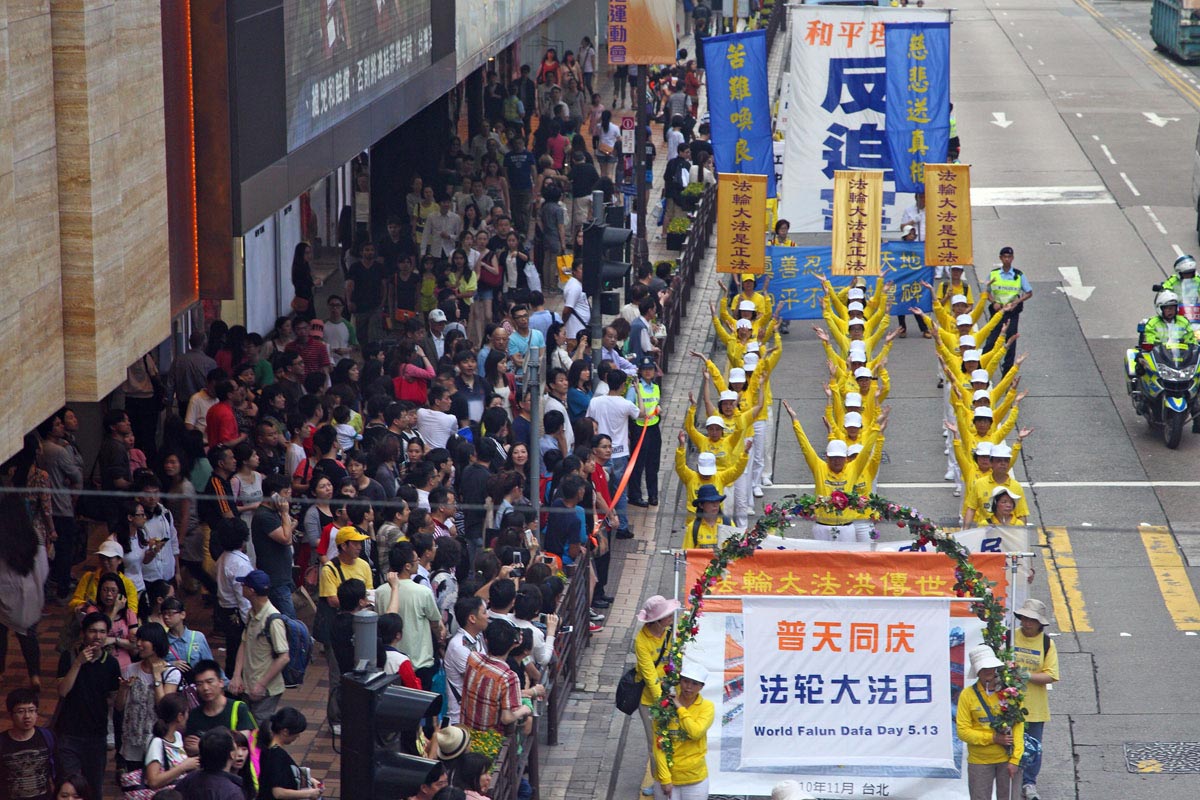 下午二点,法轮功学员的游行队伍从游乐场出发,气势雄伟的天国乐团为前导,大法弘传、演示功法队伍、和平理性反迫害旗阵、旗鼓队、真相旗阵、腰鼓队以及庆祝法轮大法日旗阵组成的游行队伍浩浩荡荡,一路在天国乐团吹奏《法轮大法好》、《法鼓法号震十方》、《法正乾坤》、《送宝》、《佛恩圣乐》、《法轮圣王》等多首正气浩然的军乐声中,穿越九龙闹市主要街道,游行队伍经过沿途,吸引道路两侧的广大民众以及游客围观,不断有人拿起手机、相机等拍摄游行画面。