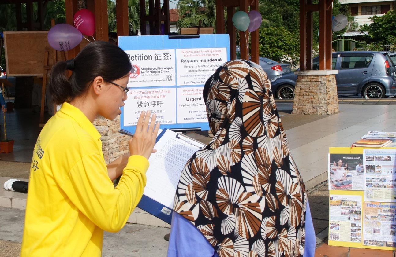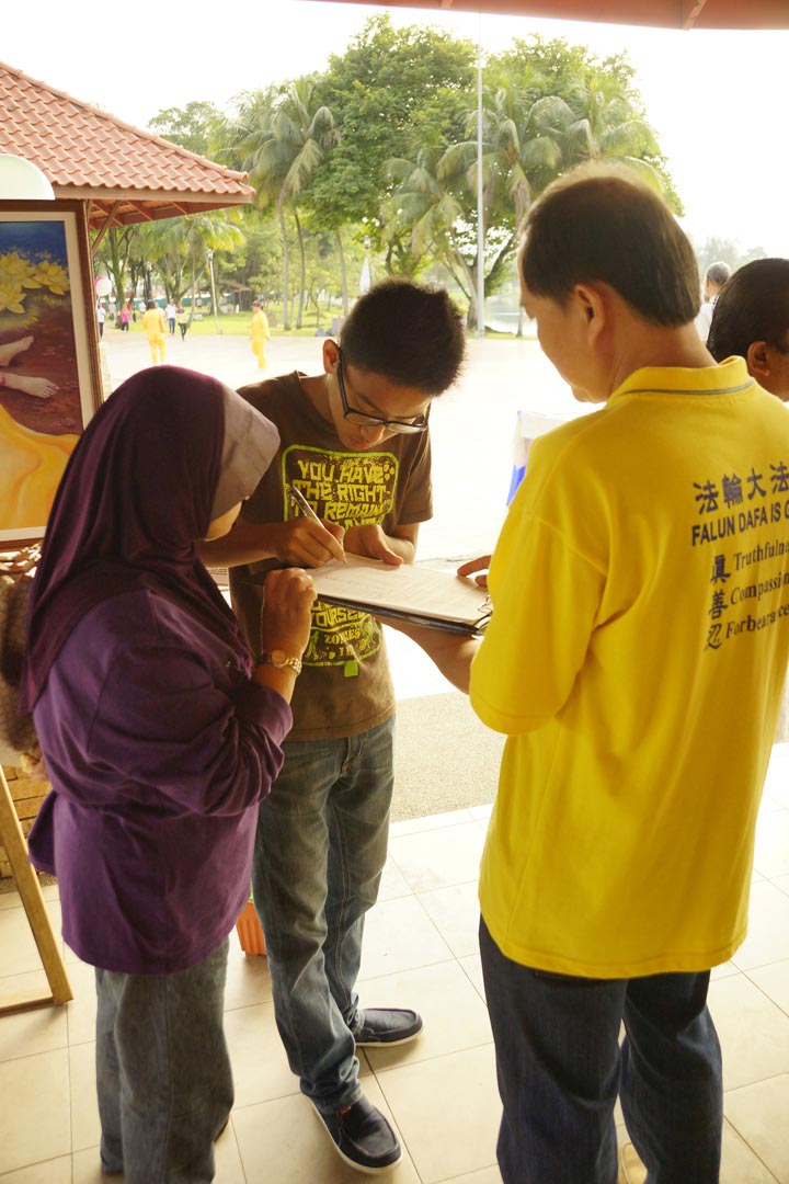一位马来男青年看了画展后表示,这样的迫害为什么没有采取任何办法来制止?负责画展的陈女士告诉他,大家可以支持这征签 活动,另一个办法就是要转告这个重要讯息给自己身边的亲朋好友,让大家来共同制止这惨无人道的迫害。话一说完,这位男青年立刻签上了自己的名字。
