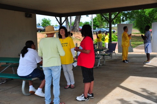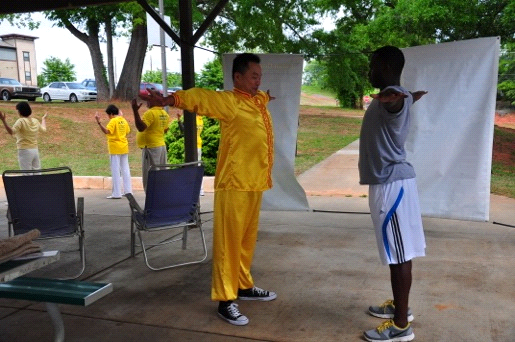 一位民众学会了学员教给他的第一套功法,动作非常标准而且表现非常宁静祥和。离开之前,他告诉学员说,他一定会回来继续学炼功法的。活动中亚特兰大的学员们明白,只要努力走出去、突破旧观念、多讲真相救度众生,师父一定会将有缘人送到我们的身边,众生就会有希望了、有救了。
