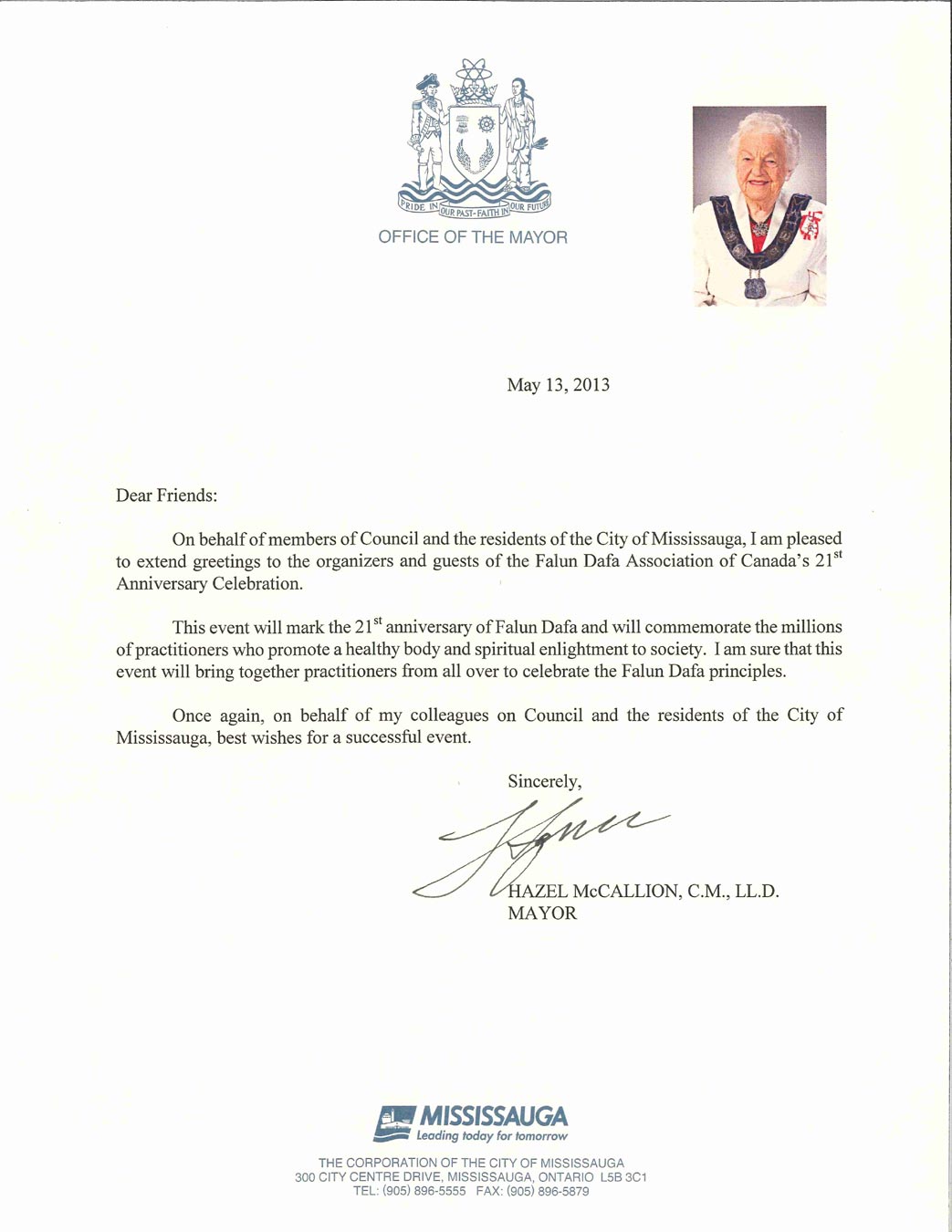 密西加沙市市长海哲澳·麦考莲(HAZEL MCCALLION)在贺信中说:“亲爱的朋友们:我仅代表密市议会所有市议员及密西沙加市市民,很高兴向法轮大法二十一周年庆祝活动的举办方法轮大法协会及此次活动的所有宾客致以问候。