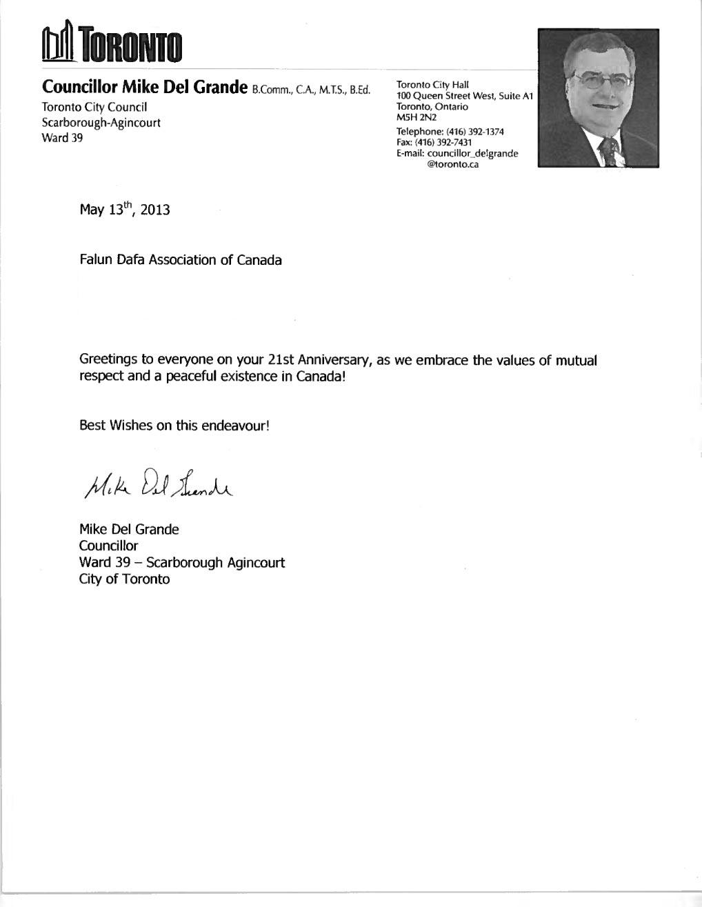 Mike Del Grande在信中说:“在加拿大,我们坚信互相尊重,和平相处的价值,在此祝福你们二十一周年的庆祝活动。”