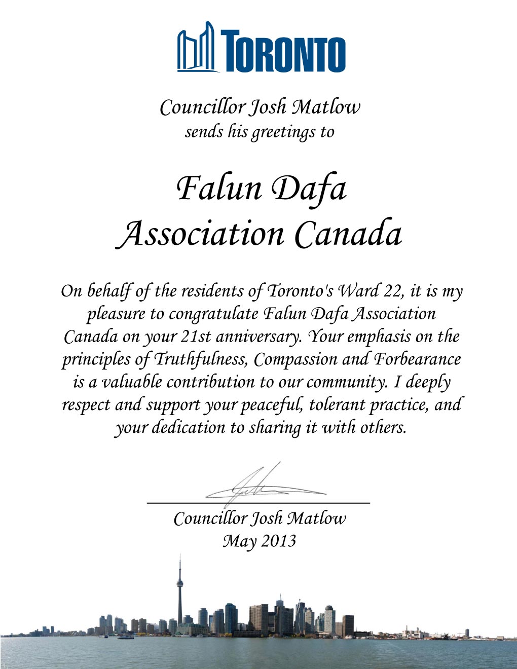 市议员Josh Matlow在贺信中说:“代表多伦多二十二选区,我很高兴在此祝贺法轮大法加拿大协会的二十一周年庆祝活动。你们遵循真、善、忍的原则为我们的社区作出了积极贡献。我敬仰并支持你们和平,宽容的修炼,以及你们积极与社区分享这一切所做出的努力。”