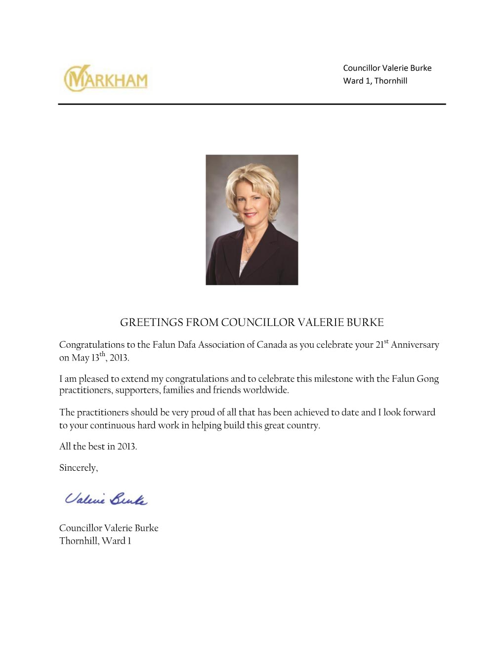 市议员VALERIE BURKE在信中说:“祝贺加拿大法轮大法协会在二零一三年五月十三日的法轮大法二十一周年的庆祝活动。我很高兴的表达我的祝贺之意,也很高兴与世界上众多的法轮功学员,他们的支持者以及家人和朋友一起庆祝这个里程碑式的节日。法轮功学员们应该为你们所取得的成绩而骄傲。我也期待你们以后继续为建设这个伟大的国家作出贡献。”