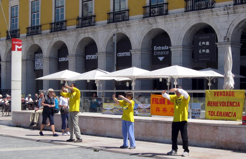 五月十一日,学员在首都里斯本Tejo海边,著名旅游景点Praca de Comercio商业广场上摆上了展板,拉开了横幅。有学员随着祥和舒缓的炼功音乐,向人们演示功法,有学员向路人散发真相传单。人们被炼功音乐吸引过来,站住观看,打听这是什么。