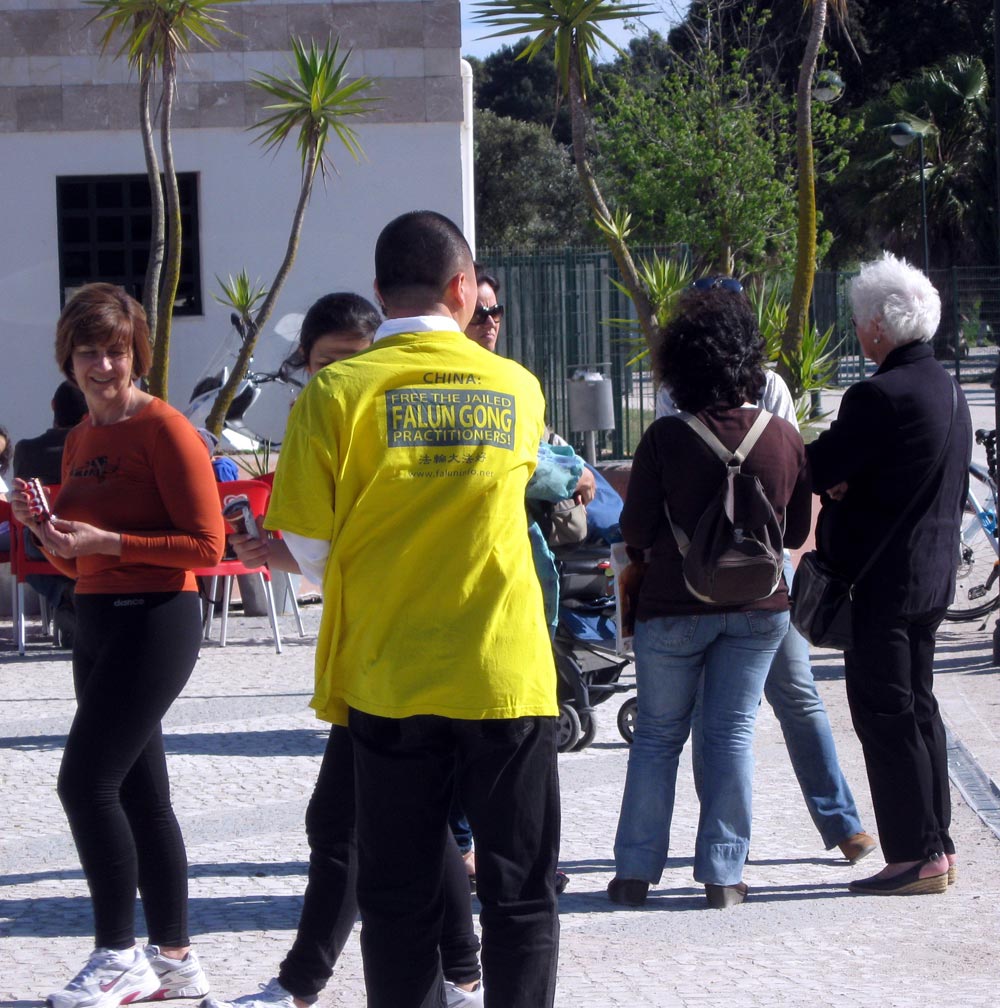当葡萄牙人接了真相传单后仔细阅读,个个神情凝重起来。有位骑自行车戴眼镜的中年男士停下车来问学员,“中国还在迫害法轮功吗?”得到学员肯定的答复后,他说:“这不能让人容忍!这只是一个信仰,竟然招来这么残酷的迫害!好几年前,我就听说过法轮功在受迫害,没想到过去这么多年了,迫害还在继续。共产党的独裁统治太邪恶了,他们竟然虐杀了这么多修炼的好人。中共是要遭上天惩罚的!祝你们好运!”