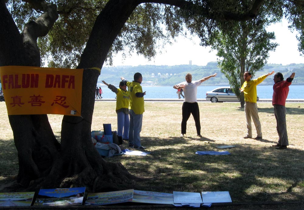 五月十二日,法轮功学员们来到了里斯本总统府附近著名景点民族公园(Torre de Belem)柏伦塔旁边,挂上“真善忍”横幅,摆出法轮功真相展板,演示五套功法。有游客走过来,惊叹:“这是法轮功!”很多游人观看功法演示。有个人看了好一会儿,过来对学员说,“我太感兴趣了,能否这会儿就教我炼功?”学员就耐心地教他,他非常认真地学。离开时他告诉学员:“感觉太好了!我还会来的。”最后拿着真相传单恋恋不舍地走了。