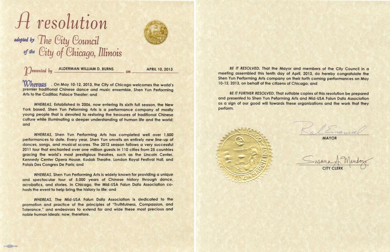 对神韵的第七度莅临,芝加哥市长、美国总统奥巴马的前白宫幕僚长伊曼·纽尔(Rahm Emanuel)签署了由五十位市议员全体通过的欢迎决议案。这已是芝加哥市议会连续第三年通过决议案,表彰神韵“与人分享对人生及世界的深刻理解和恢复中华传统文化之瑰宝”,表彰美中法轮大法学会“弘扬真、善、忍的人类最珍贵、最高尚理念”,并献上美好祝福。