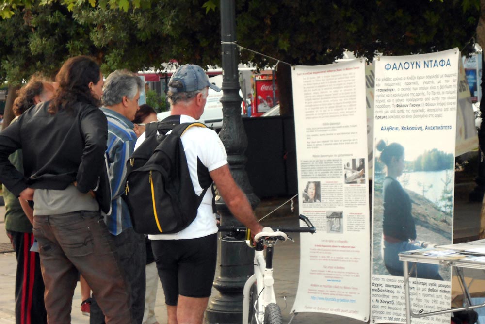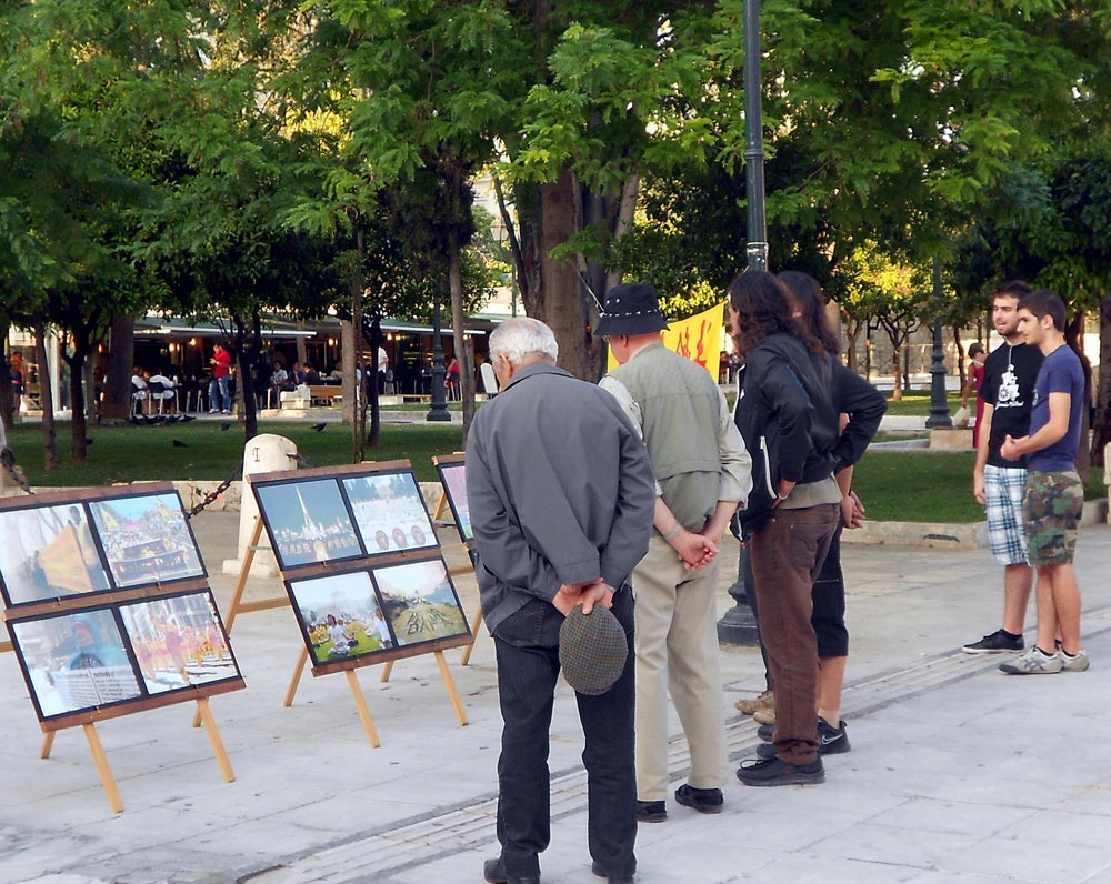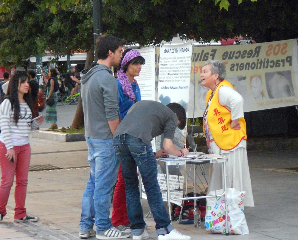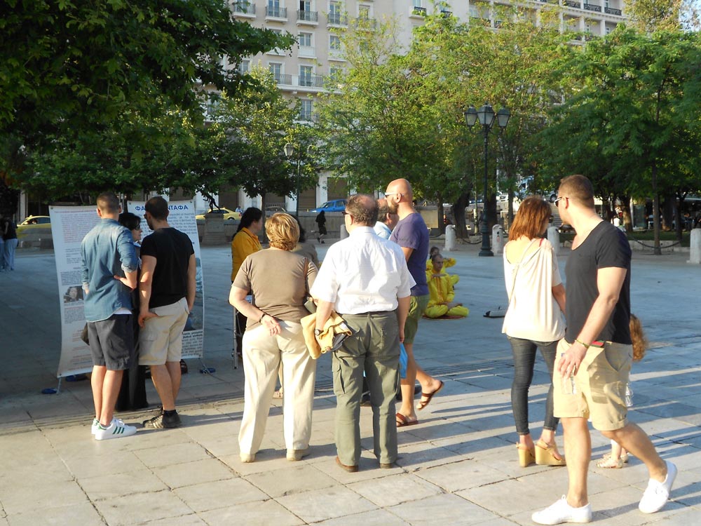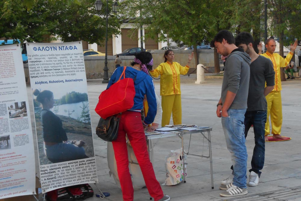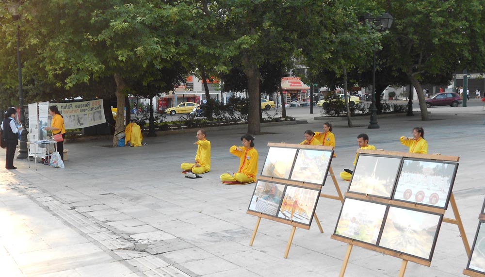 法轮功祛病健身的奇特功效和“真、善、忍”的法理,使希腊法轮功学员身心受益,个个都感受到大法的无限美好。为纪念这一高德大法洪传人世,让更多的人了解法轮功的真相,五月十二日,法轮功学员在希腊首都雅典的宪法广场(Syntagma Square)庆祝法轮大法日。学员摆放展板,拉起横幅,散发真相传单,讲大法真相,并演示功法,展示法轮大法的美好。祥和宁静的炼功音乐吸引了行人,很多人饶有兴致的观看法轮功功法演示。